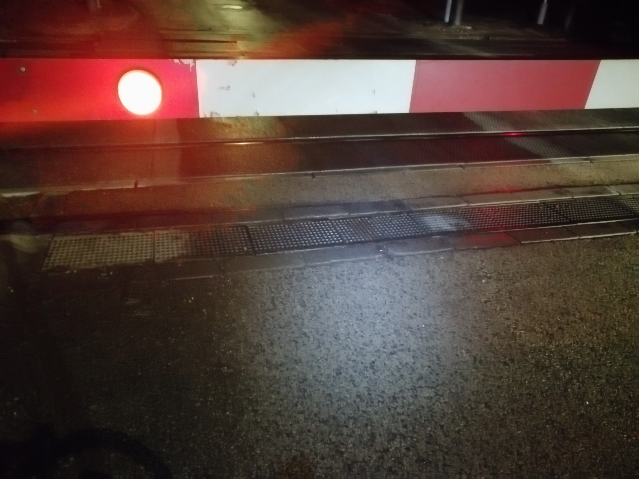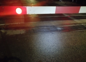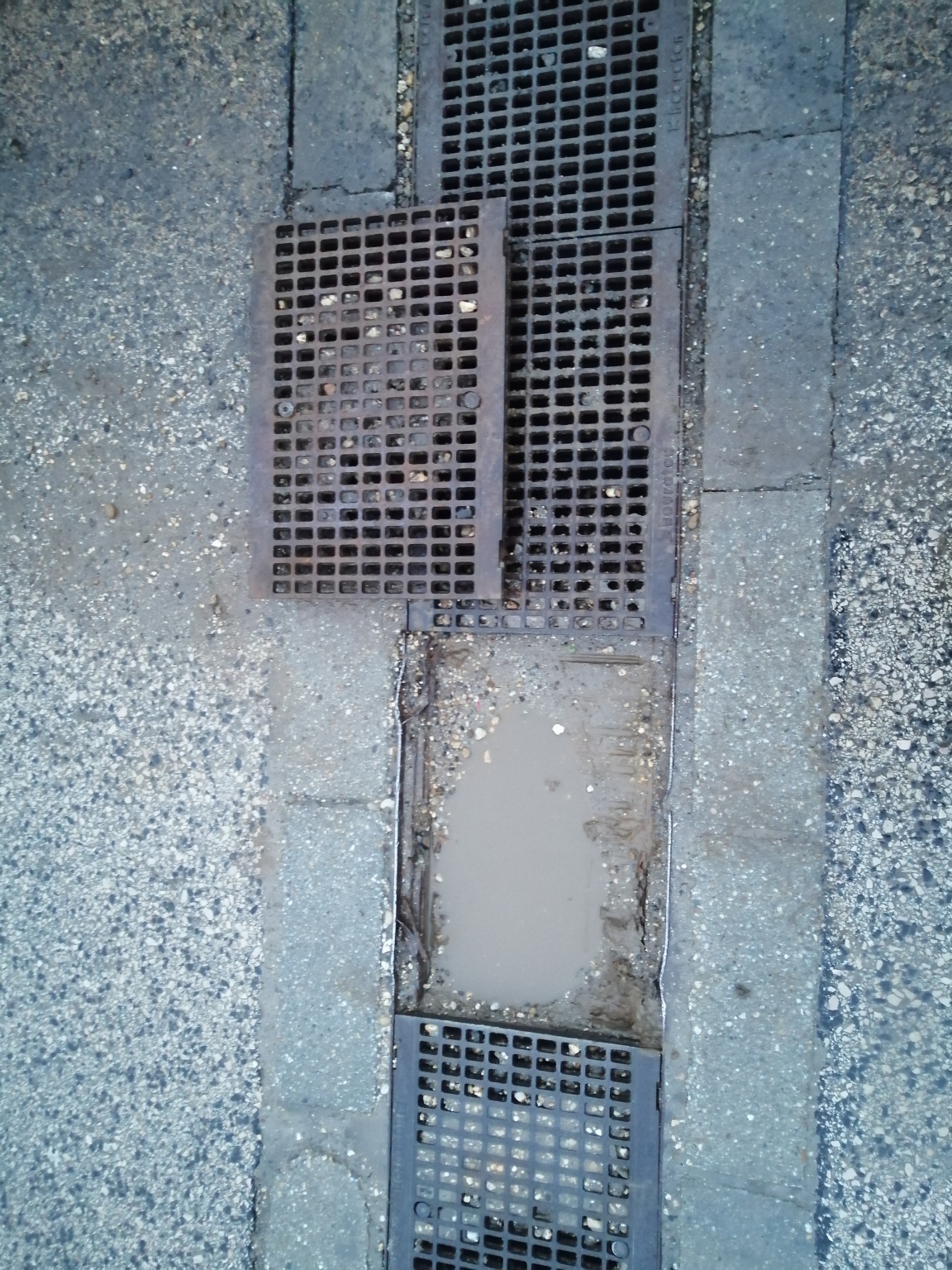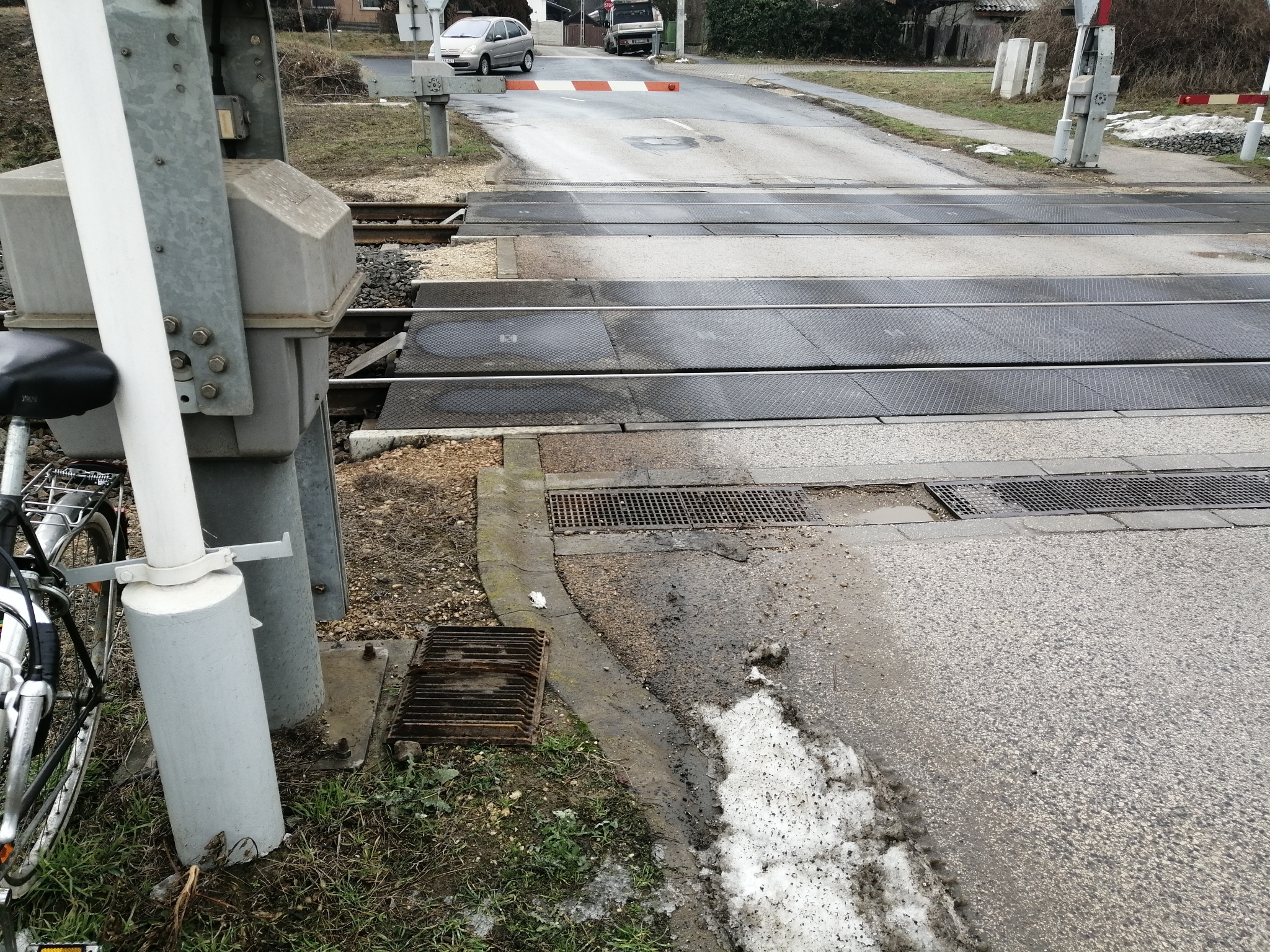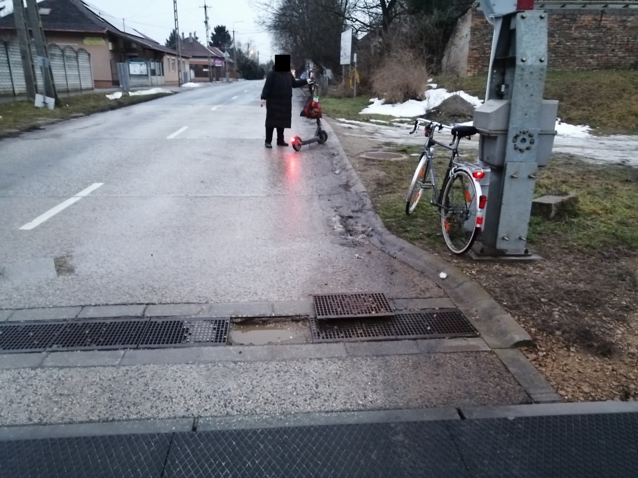 A vízelvezető vályú feltöltődött hordalékkal és vízzel, ezért a lyuk járművezetés közben nehezen észlelhető.