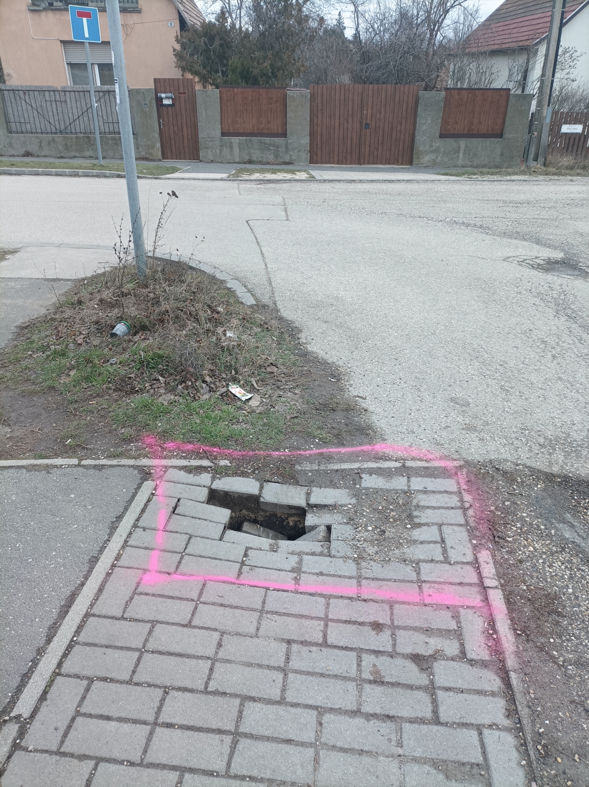 Beszakadt/aláázott járda az Aknász utca / Fűtő utca sarkán