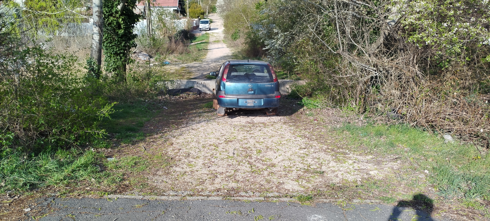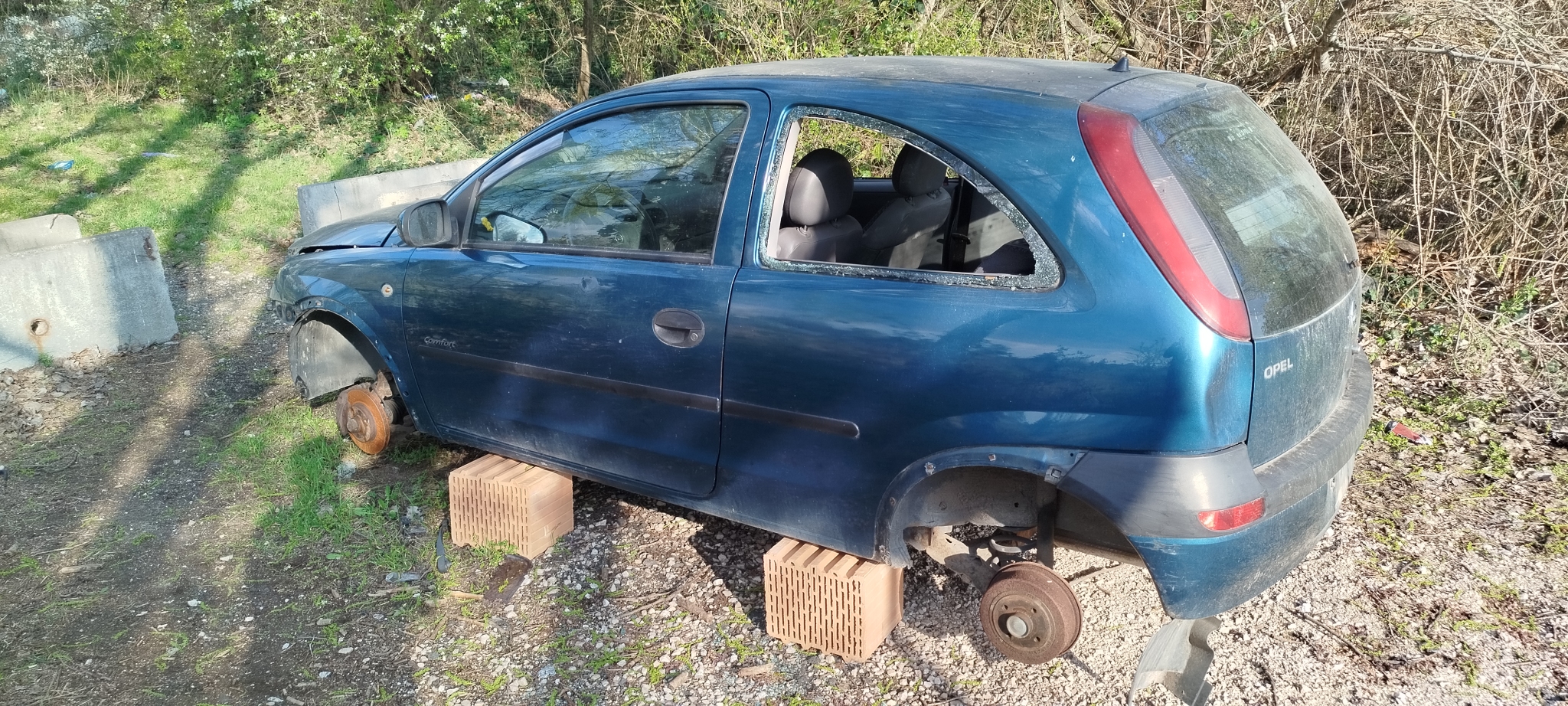 Lassan széthordott roncs Opel Corsa.