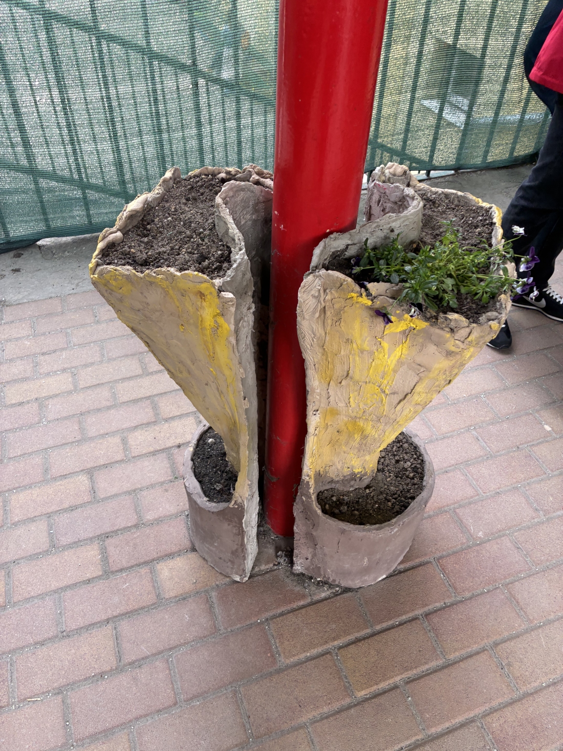 Az Érdligeti Általános Iskola Diósdi úti épületének bejárata előtt áll több hasonló virágcserép, ami instabil, dölöngél balesetveszélyes a gyerekekre nézve,