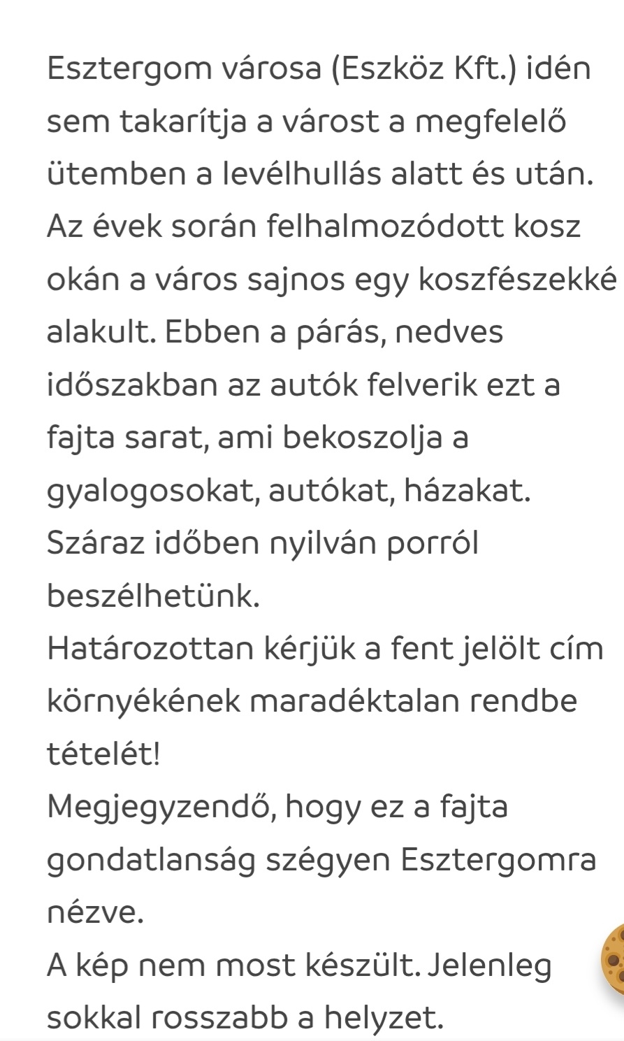 Az előző bejelentésben kértük, hogy a város (Eszköz Kft.) tegye végre rendbe a környéket. Járhattak itt, mert azt tapasztaltuk, hogy a térkőről hanyagul a zöld felé söpörték a fákról lehullott ágak és levelek sárrá alakult maradékát. Annak eltávolításáig már nem jutottak, illetve a zöld rész és az út részükről továbbra is érintetlen maradt. A parkoló autók körül is kérjük ezek eltávolítását, hogy ne a sárban kelljen járnunk! Fenntartom, hogy városszerte ez a fajta gondatlanság nagyban hozzájárul ahhoz, hogy az ország egyik legszebb városa sajnos a koszban úszik. Az Eszköz Kft. felé az üzenetünk: Amennyiben a fenti kérésnek maradéktalanul nem tesz eleget 2025.12.23-ig, úgy a következő felkérést a város jelenlegi első emberének címezzük.