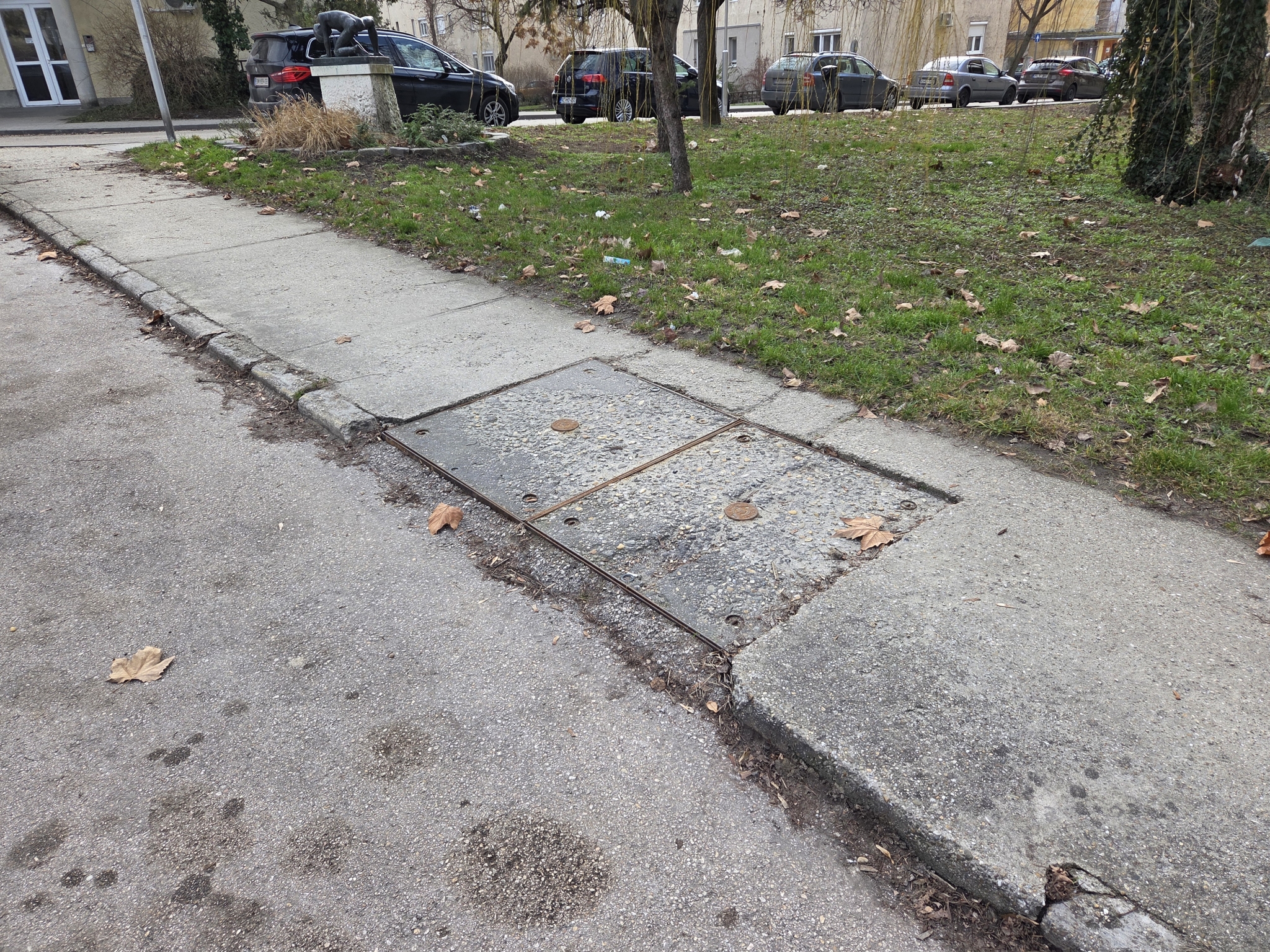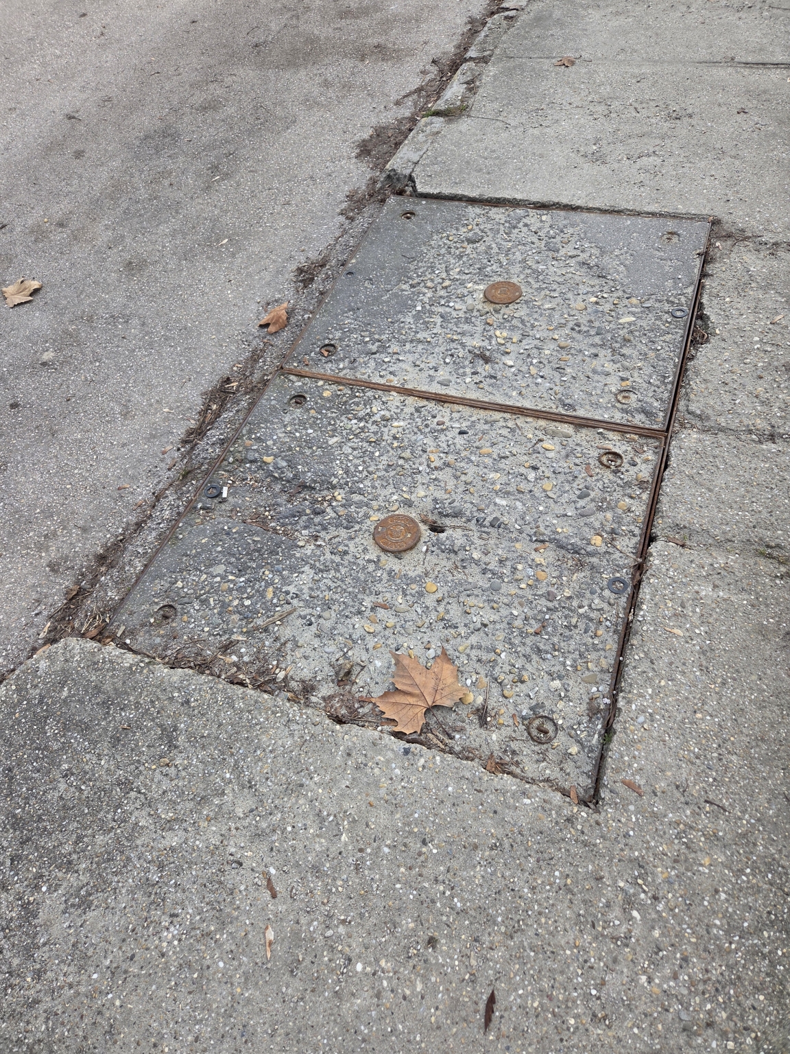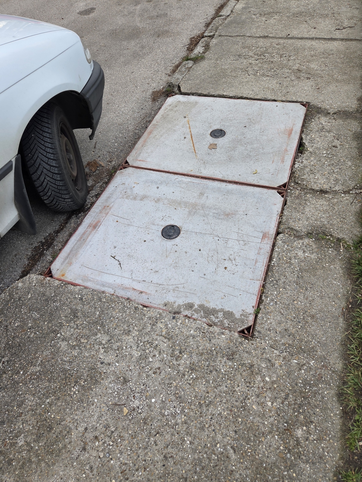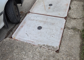 A járdán lévő Matáv feliratú aknatető rálépve recseg ropog, beszakadás veszélyesnek tűnik.
