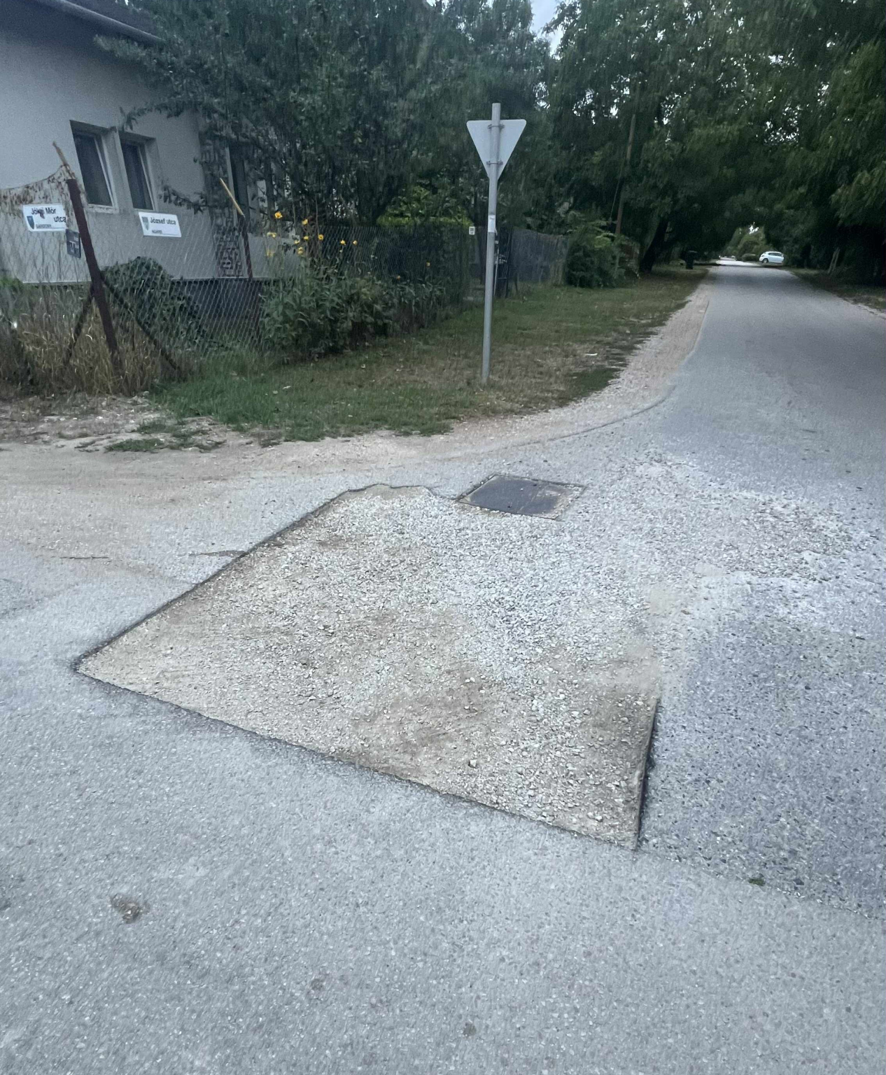 Sérült útszakasz, éles peremekkel. Csőtörést követően a helyreállítás elmaradt.