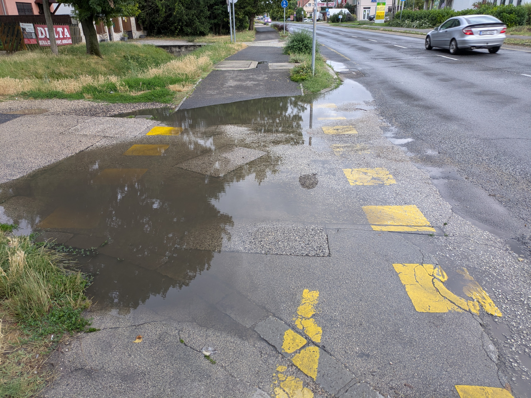 Esőzést követően a rossz vízelvezetésnek köszönhetően jelentős mennyiségű víz gyűlik össze így sem bicikli sem babakocsi itt nem tud átmenni csak jelentős trükkök árán!