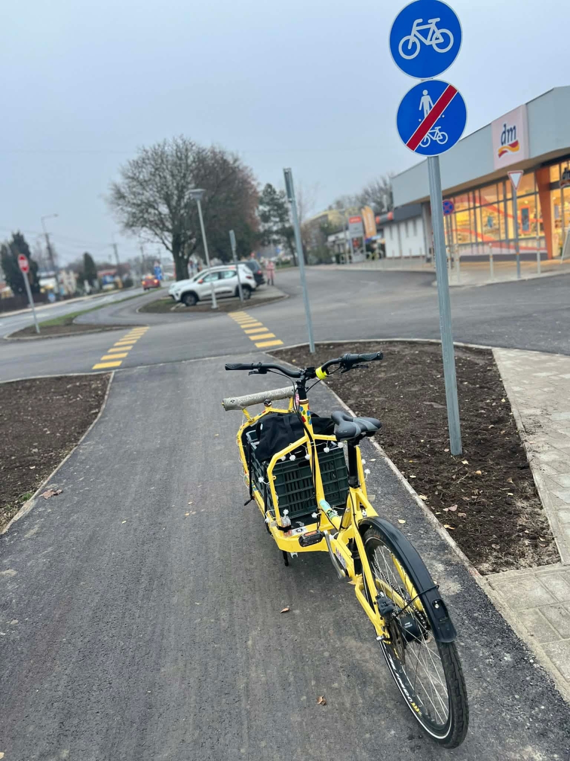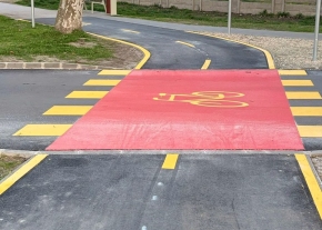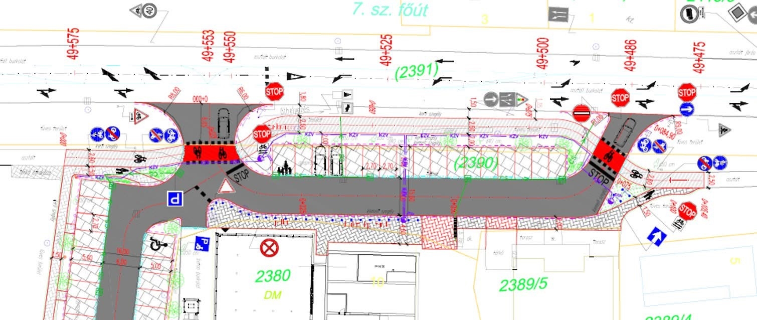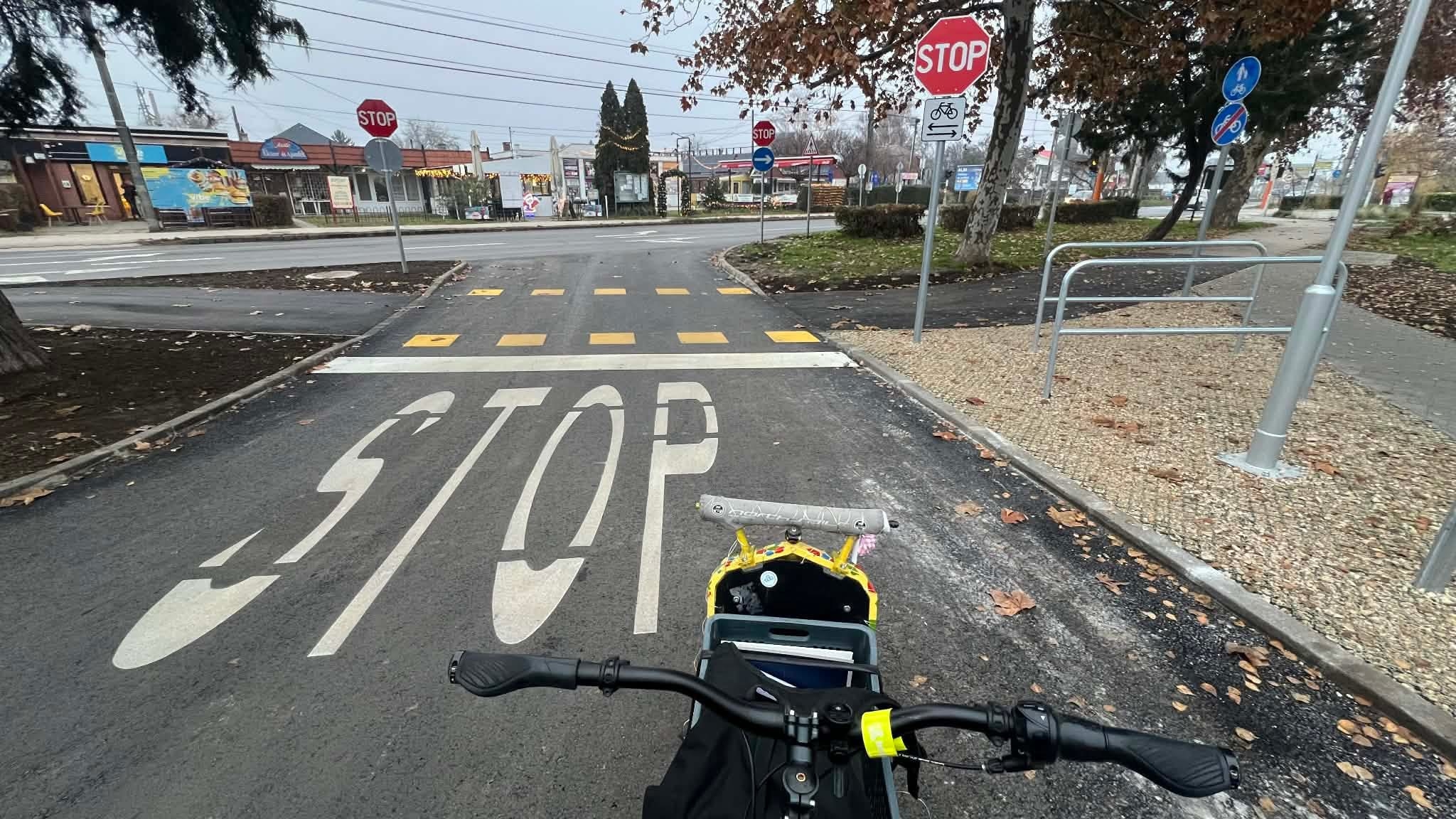 A tervekehez képest a kerékpárút piros burkolati jele hiányzik. fontos lenne, hogy pótolják hiszen egy új forgalmi helyzetben a védtelen közlekedők biztonsága kiemeleten fontos.