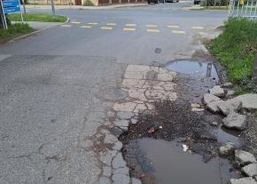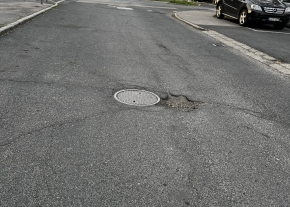 Balesetveszélyes úthiba és beszakadt csatornafedél