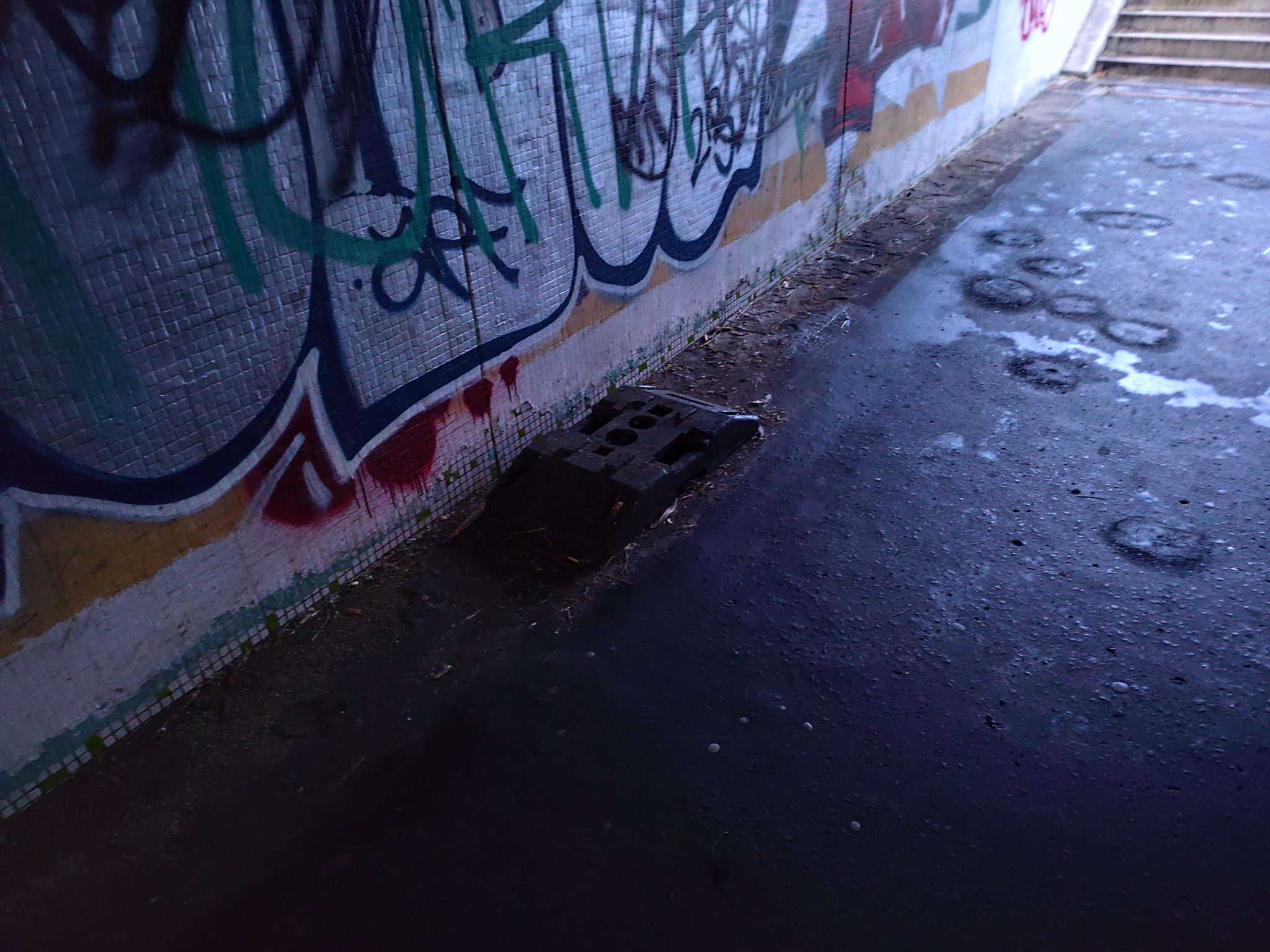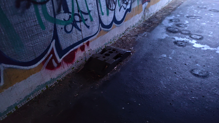 Szabadhegyi gyalogos aluljáróban korábban egy ideiglenes terelő tábla volt kihelyezve, vélhetően a beszakadt csatorna javítás idején. A munkálatok már legalább egy éve befejeződtek, azonban a tábla fekete, műanyag talpa azóta is a helyszínen maradt.
