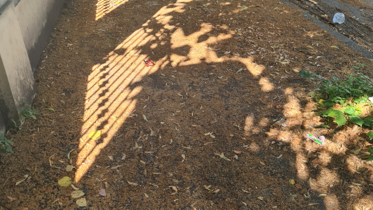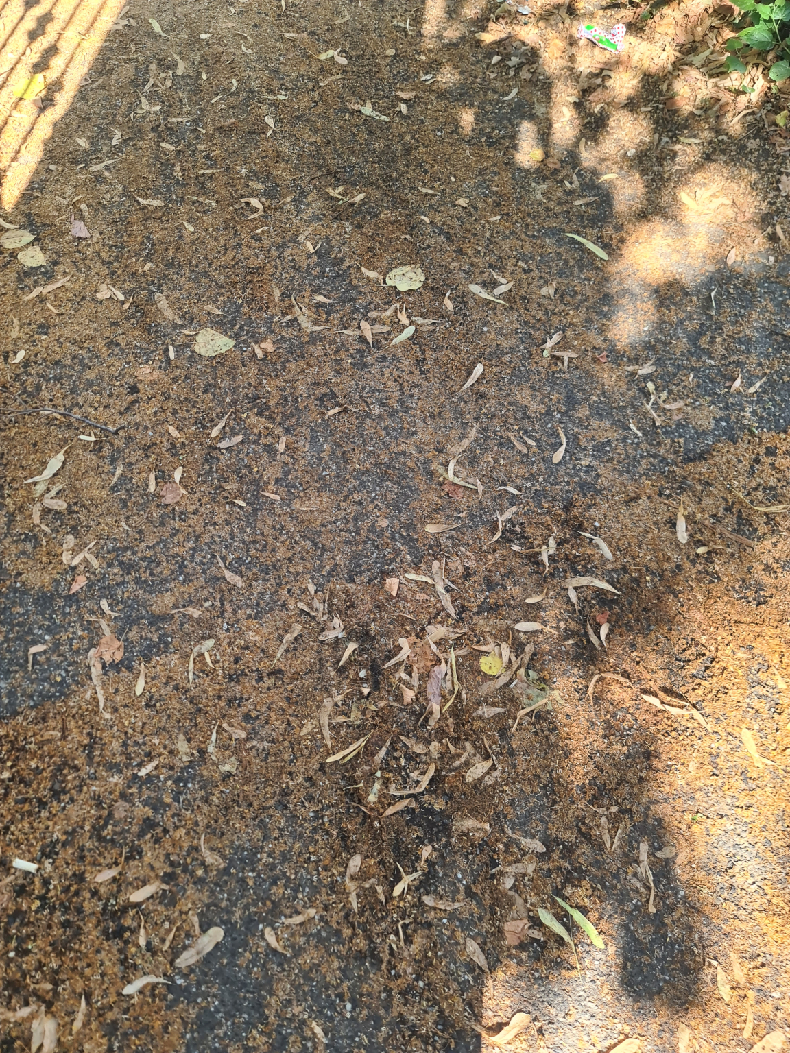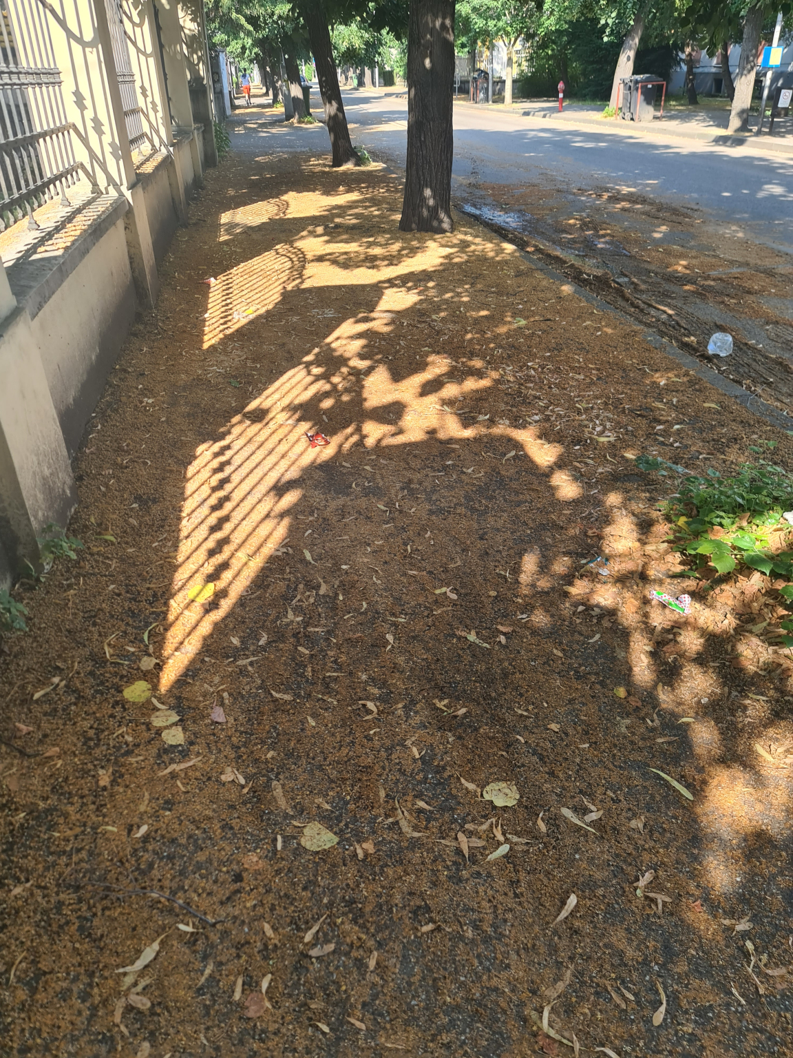 Győr, Buda utcában menetirany szerinti bal oldali járdán a hársfa virag ellepte a járdát, csúszós a felület.
