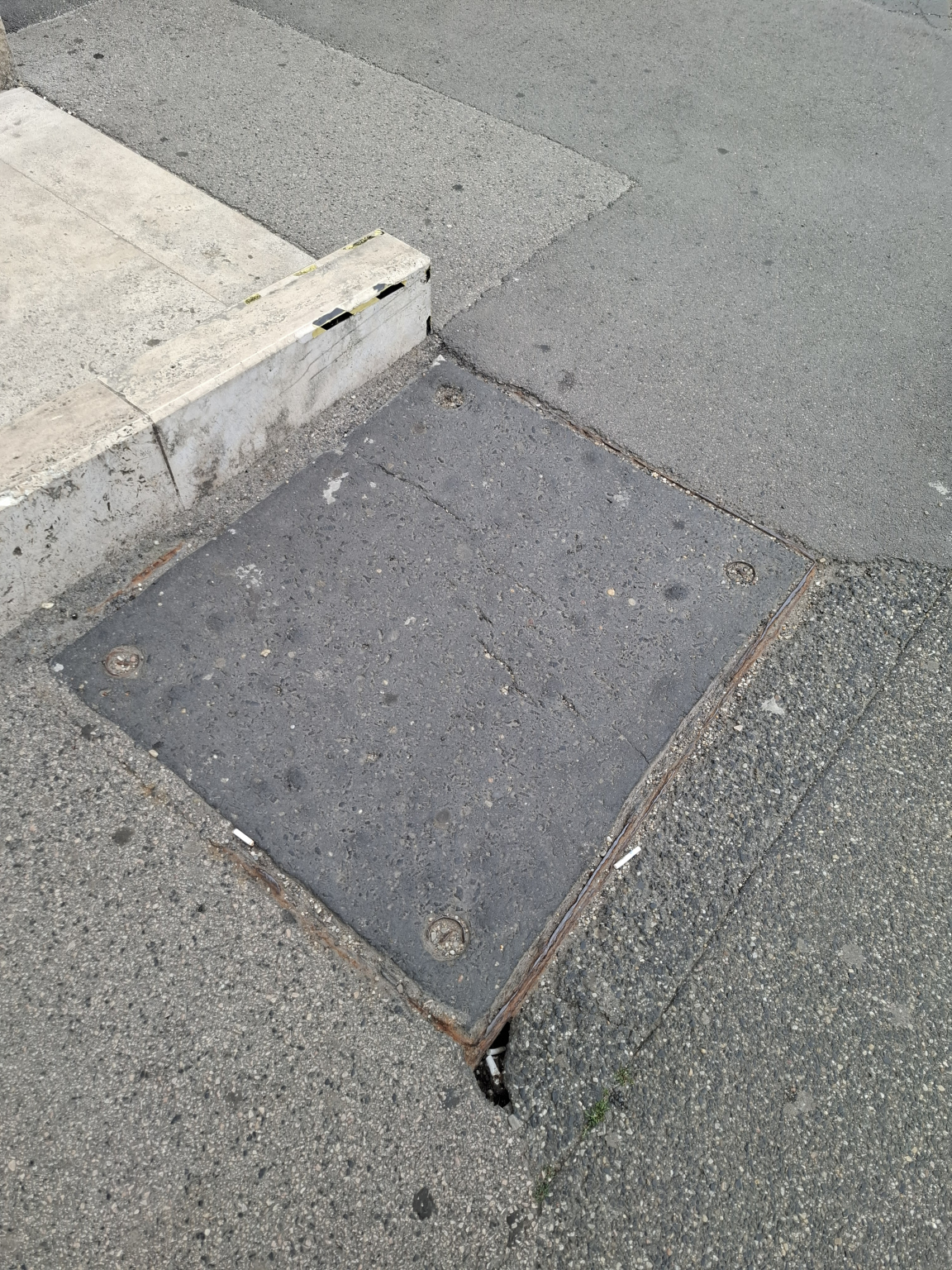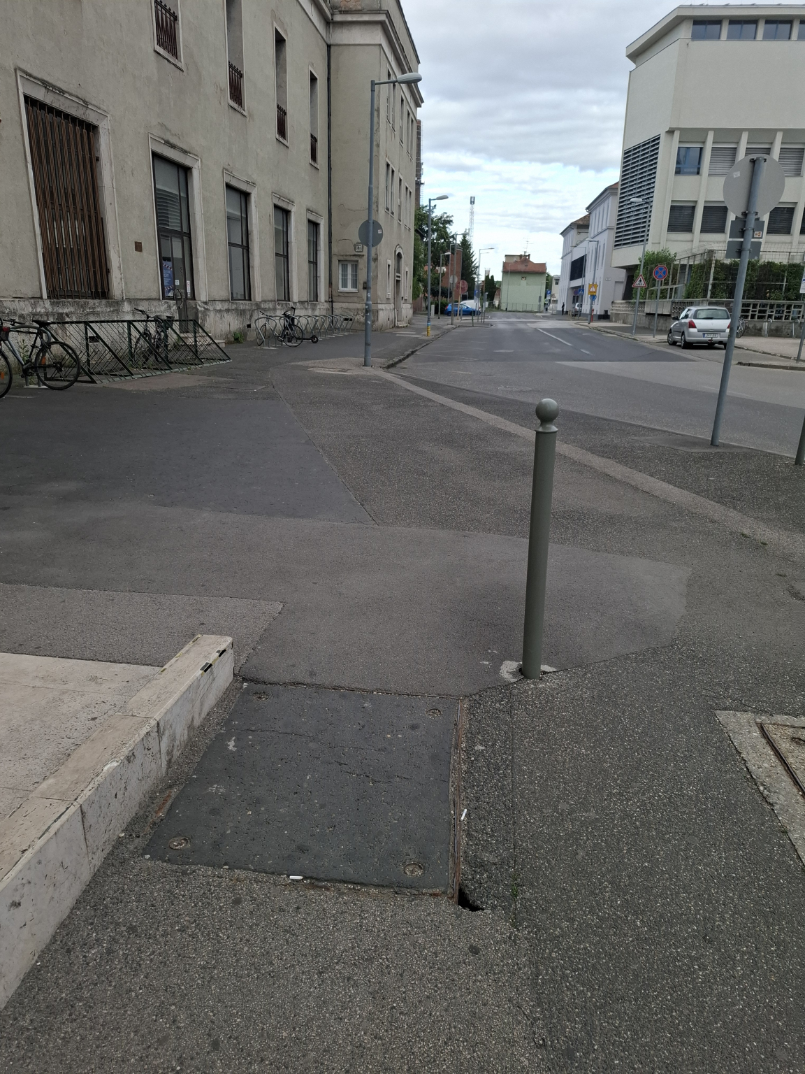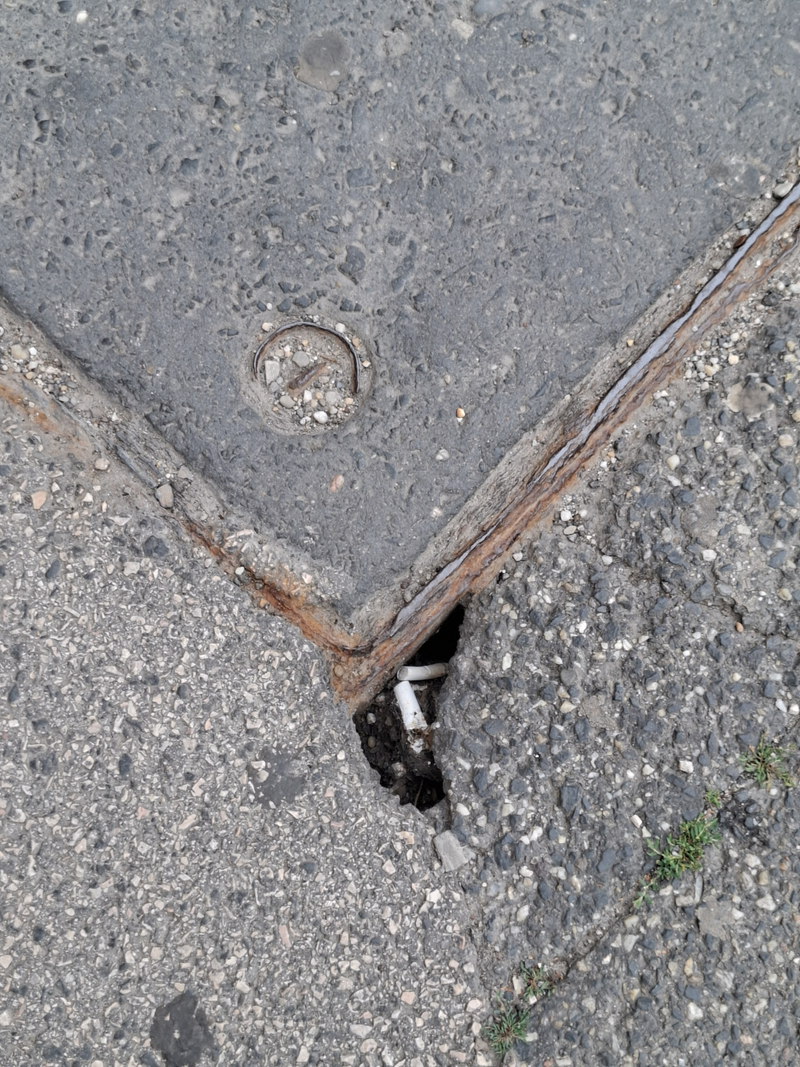 Sérült, szélénél lyukas aknafedél a feljáró előtt.