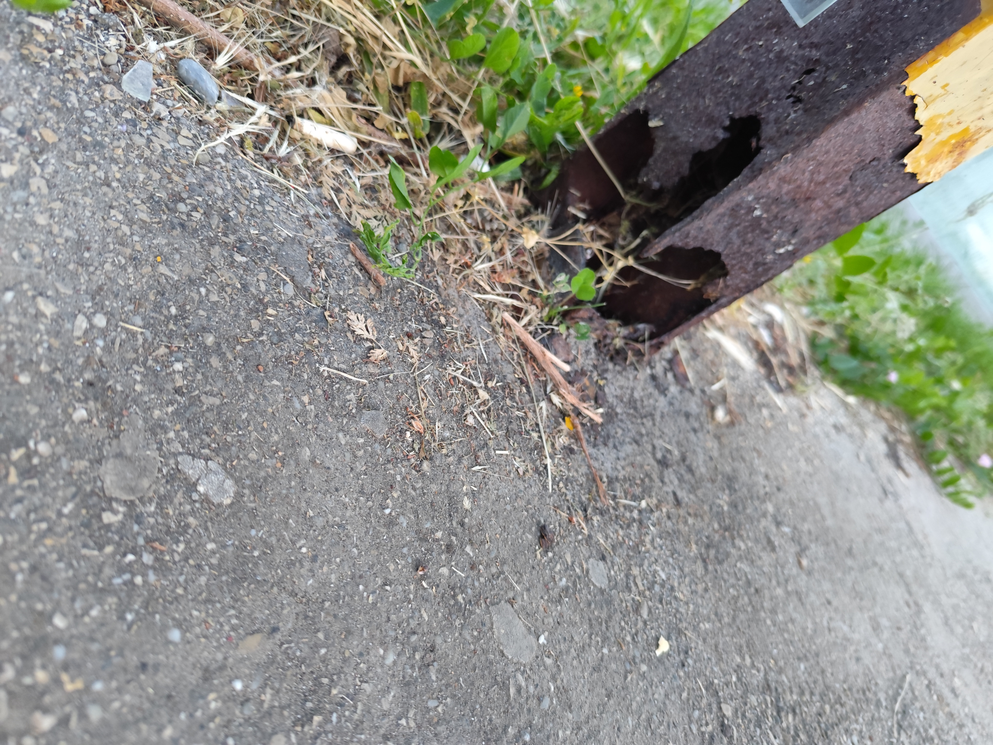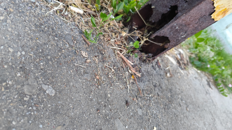 Buszmegálló esőbeállójának egyik tartóoszlopa erősen korrodált, az alja teljesen elrohadt. A szerkezet instabillá válhat, így balesetveszélyt jelent a várakozók számára.
