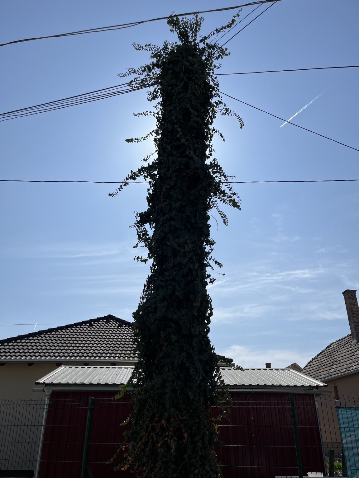 9011 Győr, Zrínyi köz 1. házzal szemben a fa villanyoszlopot teljesen benőtte a borostyán.