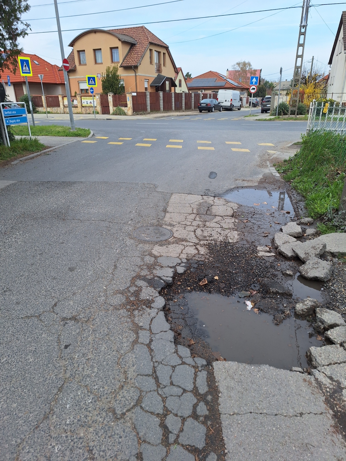 Az utcába történő be és kihajtás életveszélyes, mert az utca bejáratánál egy hatalmas kátyú van igy át kell menni az út túloldalára, hogy kitudjon hajtani az ember az utcából. Ha szembe jönnek könnyen össze is ütközhetnek az autók.