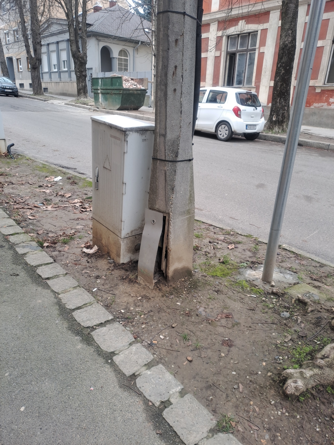 Sürgősen javításra szoruló villanyoszlop. Rippl-Rónai utca - Kontrássy utca sarkán.