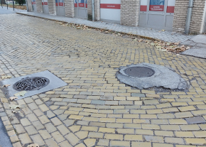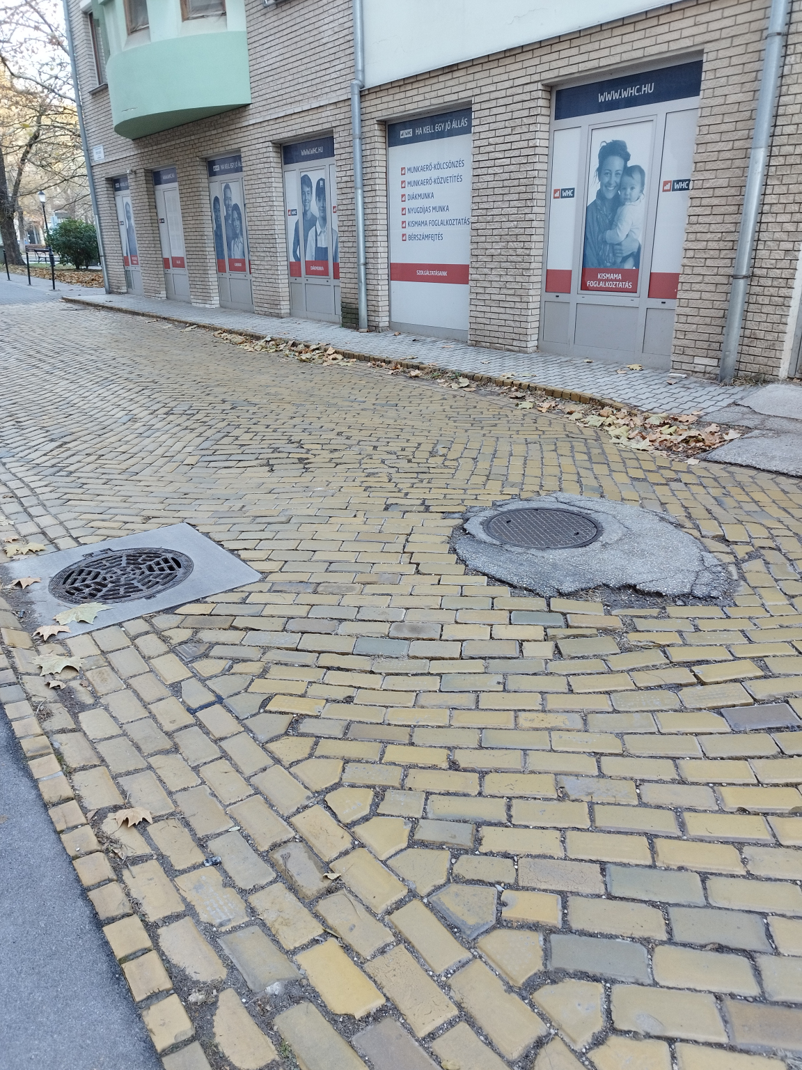 Illetve kicsivel beljebb a csatorna fedlap körül erősen megsüllyedt az út. Elég nagy a különbség a csatorna szintje és a kövek szintje között. Legalább 20 cm a letört betonnál.