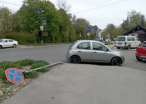 A Kaszap utca végén, a közlekedési lámpára figyelmeztető tábla erősen megkopott. A háromszög már egyáltalán nem kivehető.
