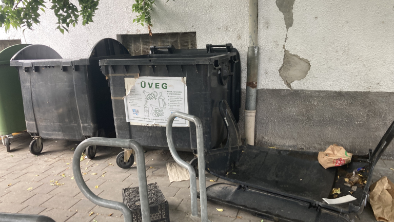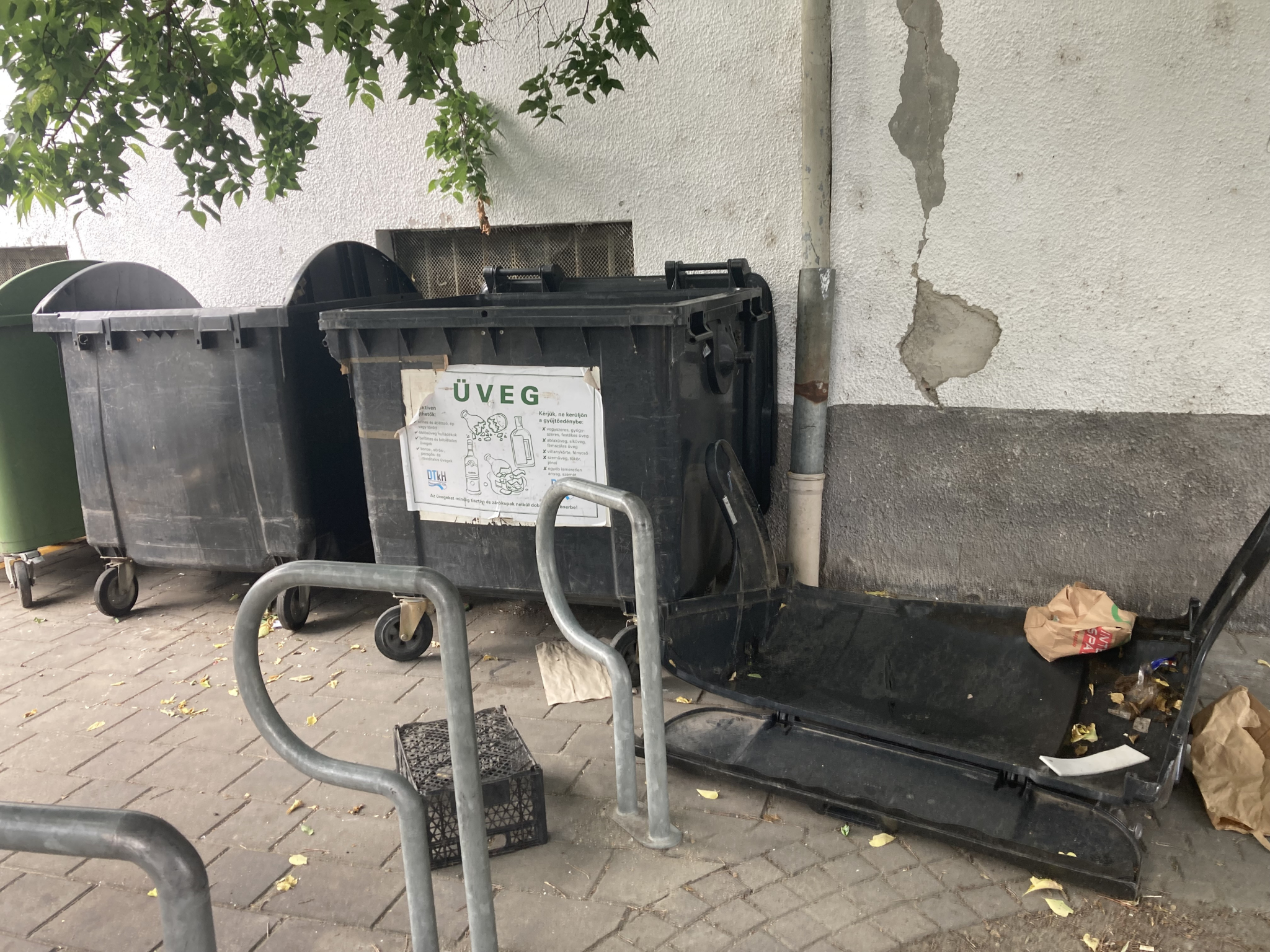Kecskeméten, a piac hátsó bejáratánál lévő üveggyűjtő kukák és környékük katasztrofális állapotot tükröznek, az egyik kuka teteje a földön... Emellett még nagy probléma az is, hogy ezek a kukák közvetlenül a kerékpártárolók mellé lettek kirakva. A rengeteg üvegcserép kerékpár elhelyezésére nem túl vonzó…