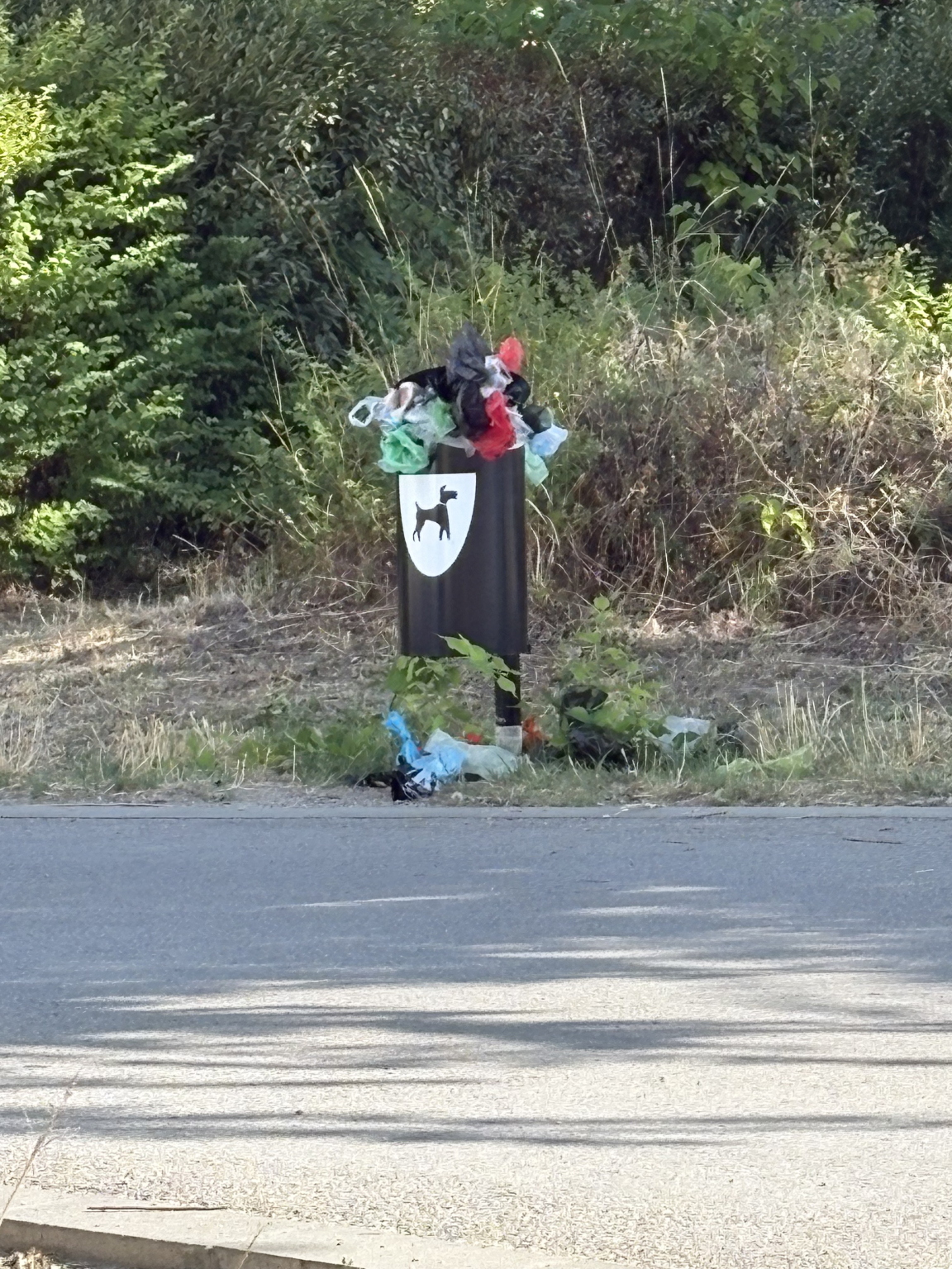Nagy László utca sarkán kutyaürülék tartó tele van, környéke szemetes, büdös, legyekkel szennyezett.