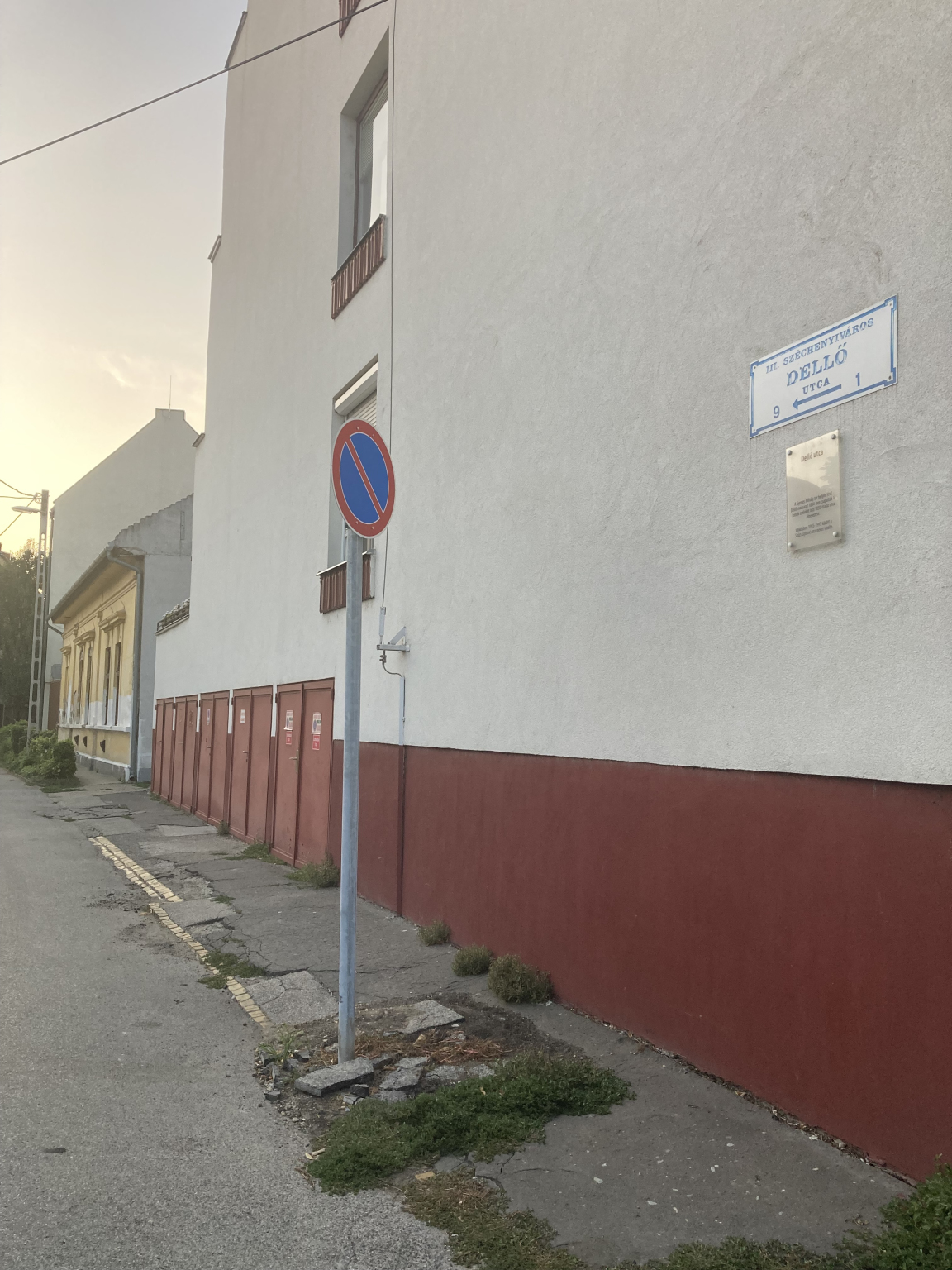 Kecskeméten, a Sántha közről a Dellő utcára befordulva látható közlekedési tábla ki van lazulva és elfordult. A járda karbantartása is időszerűvé vált.