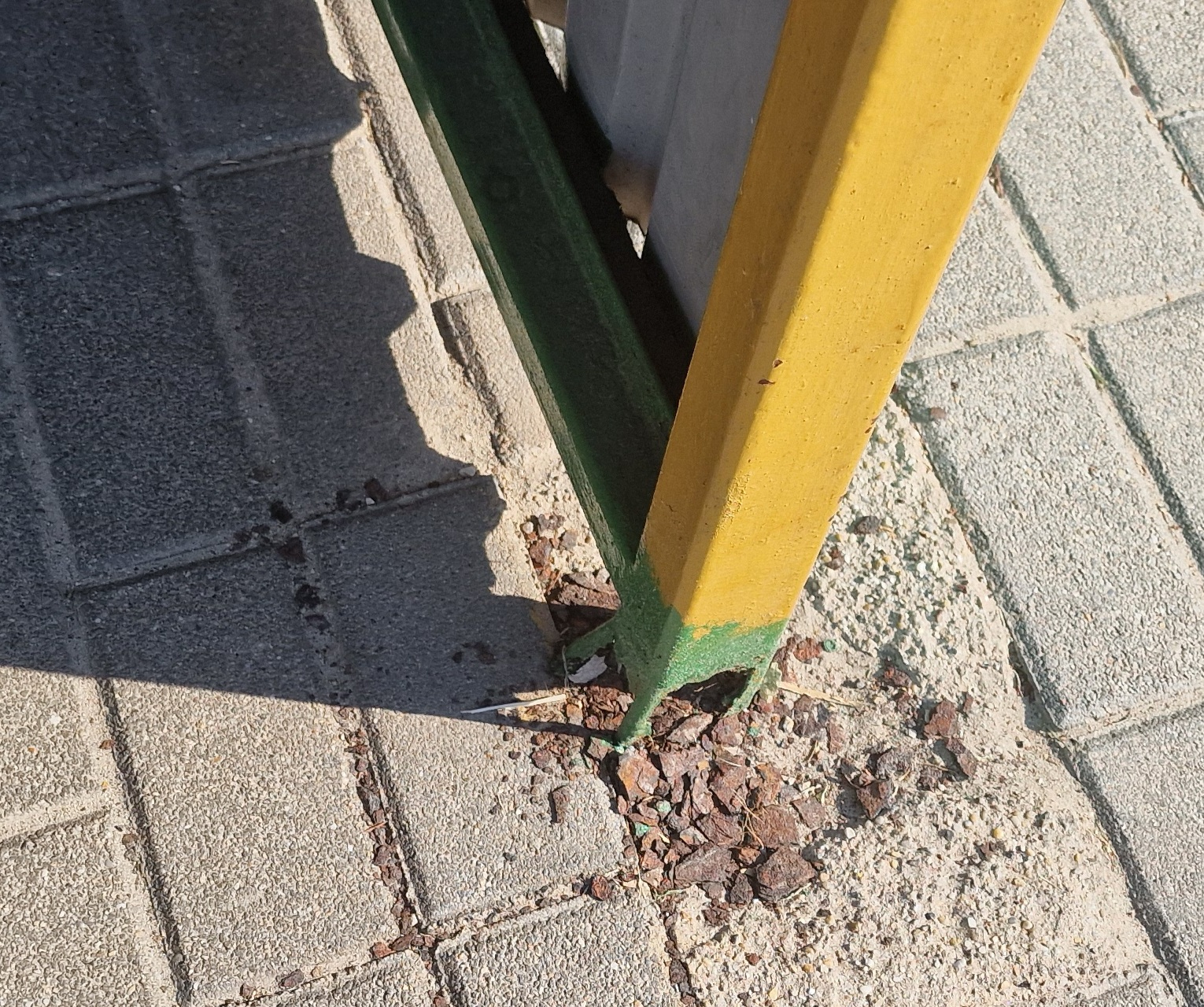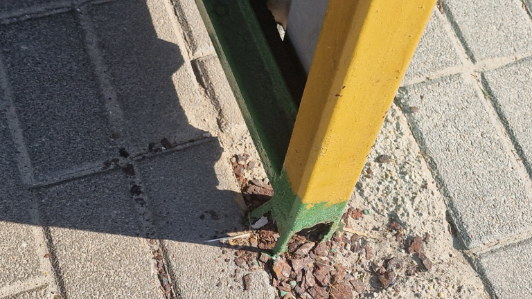 Iskola előtti buszmegálló talajhoz rögzítése erősen korrodálodott. Nagyobb szél esetén fennáll a veszélye a mögötte lévő járdára borul.