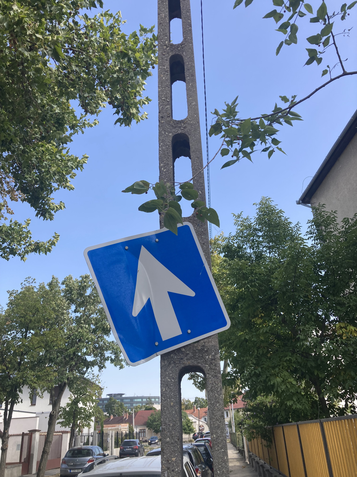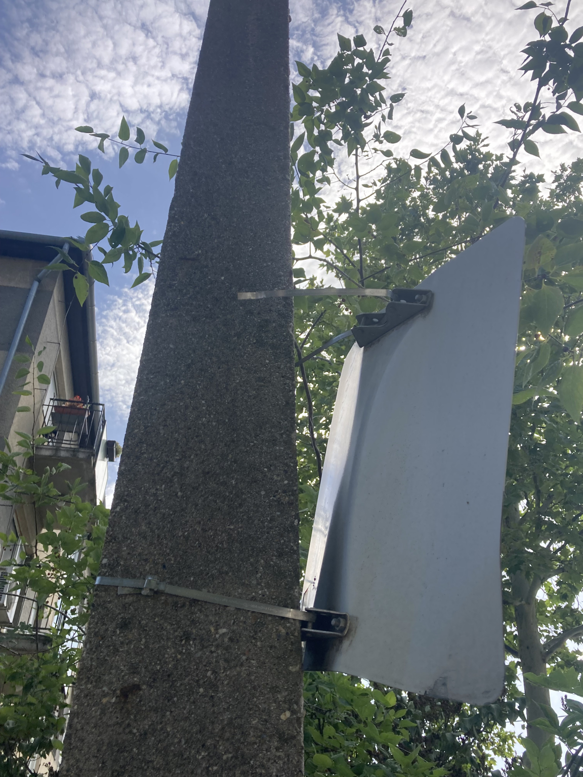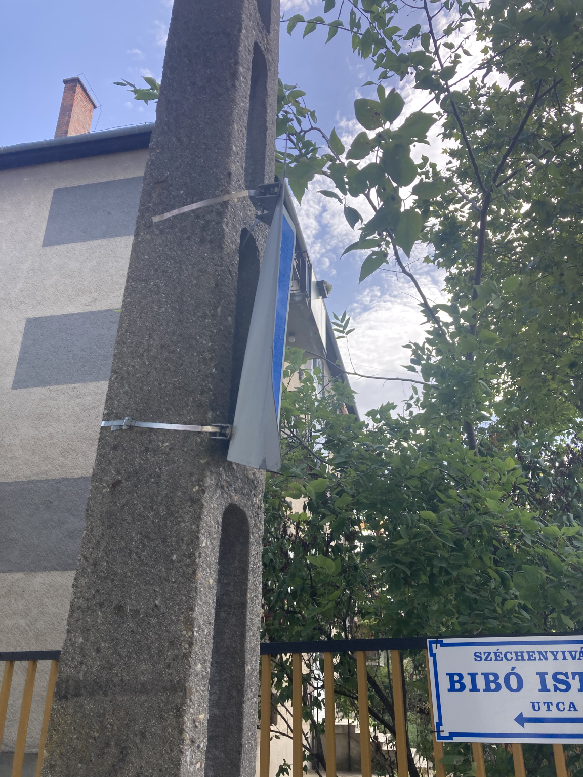 Kecskeméten, a Bibó István és a Tihany utca kereszteződésénél az oszlopra erősített közlekedési tábla egyik fémpántja el van szakadva. Balesetveszélyes.