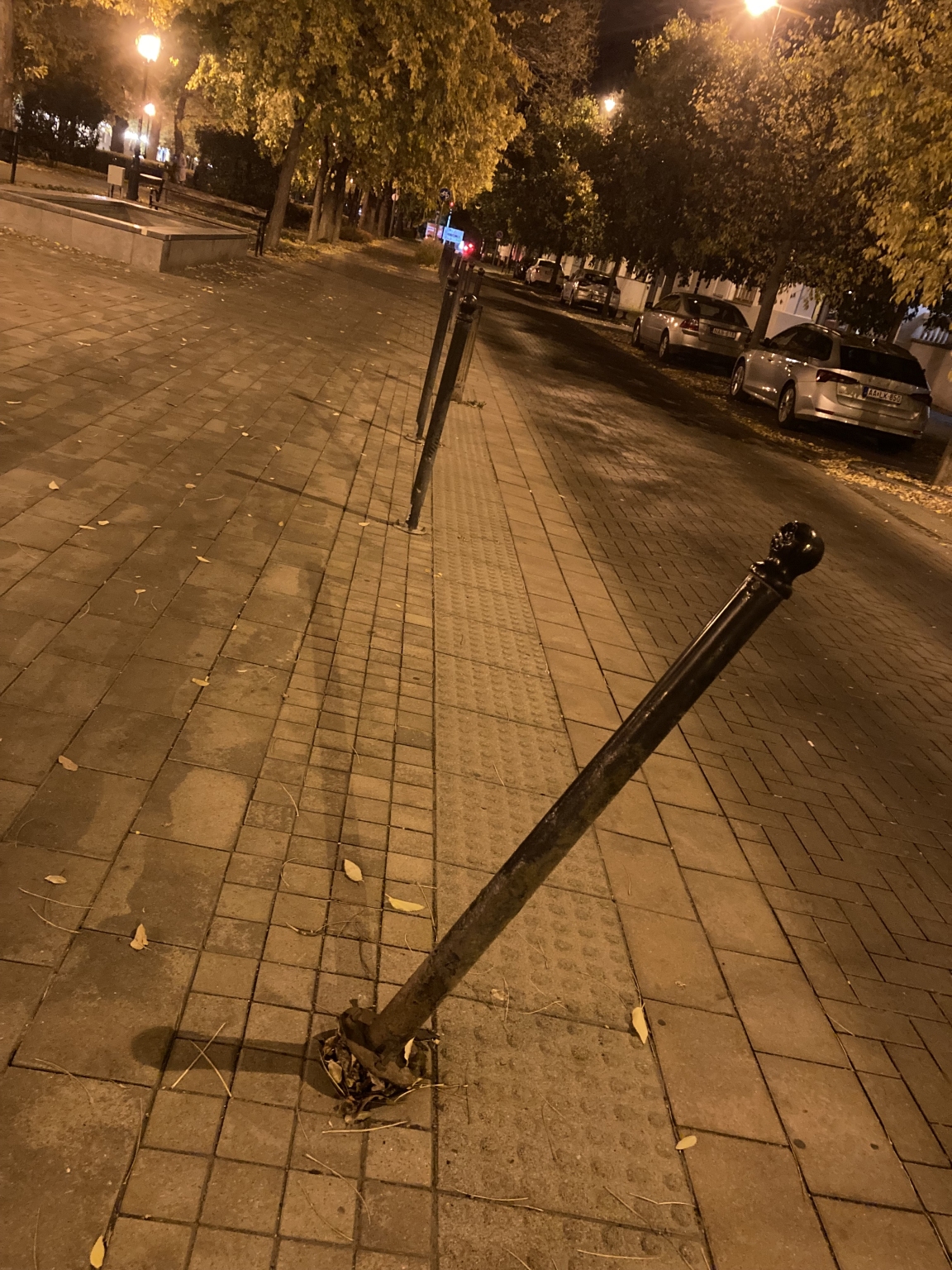 Kecskeméten, a Rákóczi út városból kivezető oldalán, a kerékpárutat az autóúttól elválasztó oszlopok egyike veszélyesen kilazult, akár az úttestre is kidőlhet.