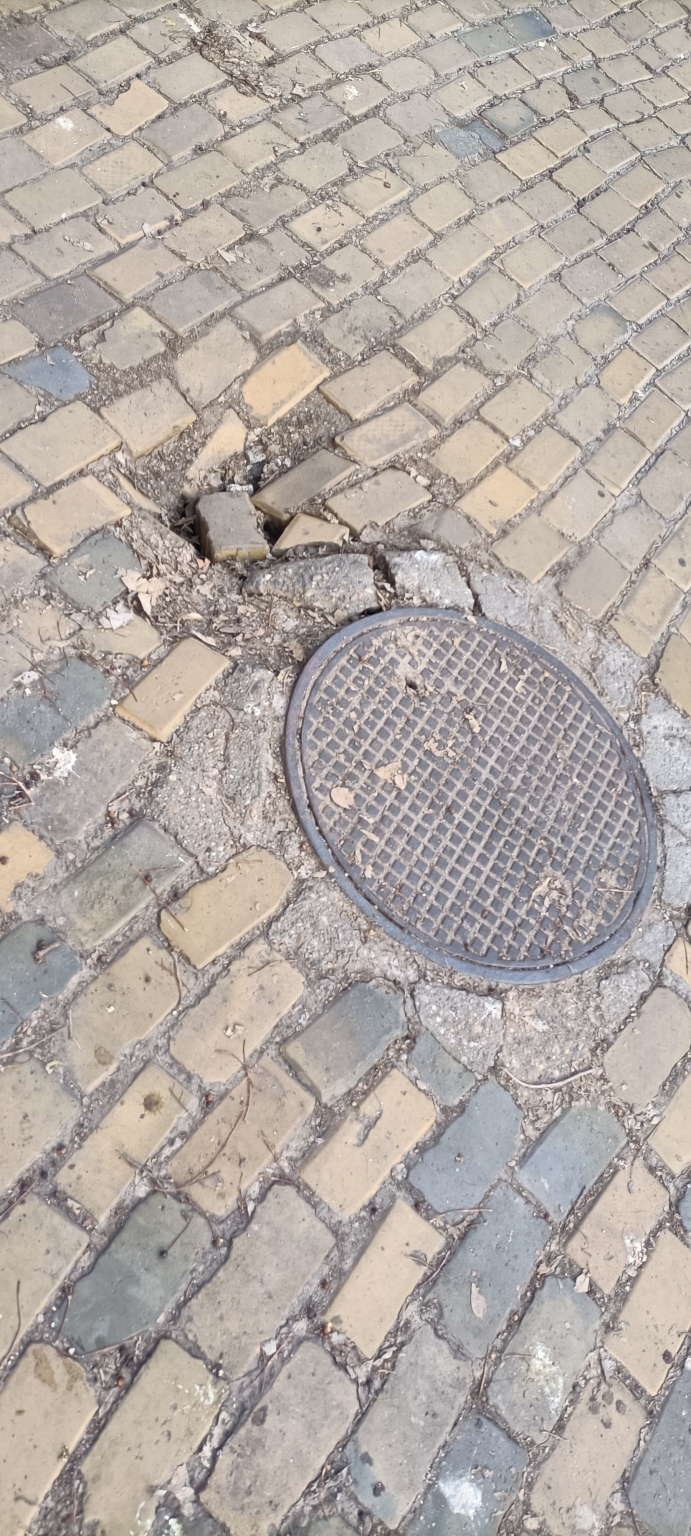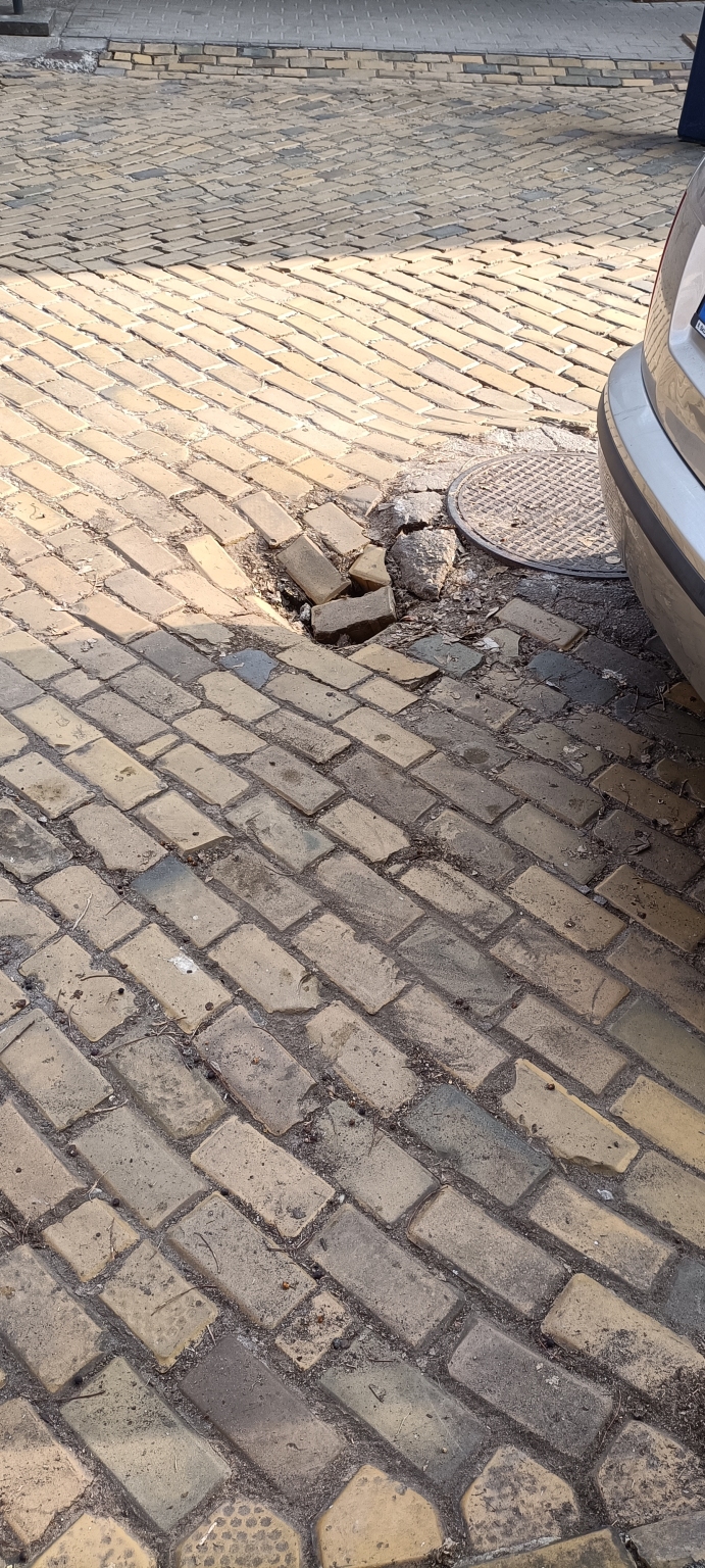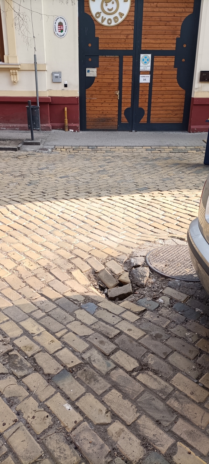 Kecskemét Klapka utca 14 szám előtt az Aranytulipán óvodánál megsüllyedt az akna körül az út.