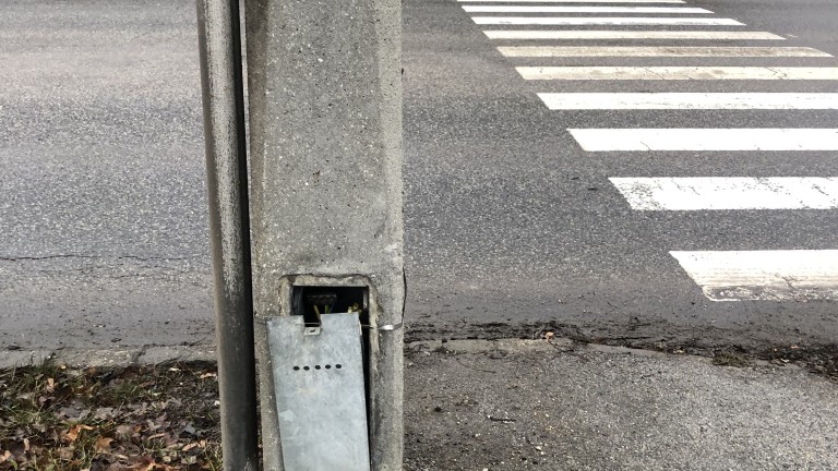 A Szent Anna téri gyalogátkelőnél lévő villanyoszlop ajtaja elmozdult.