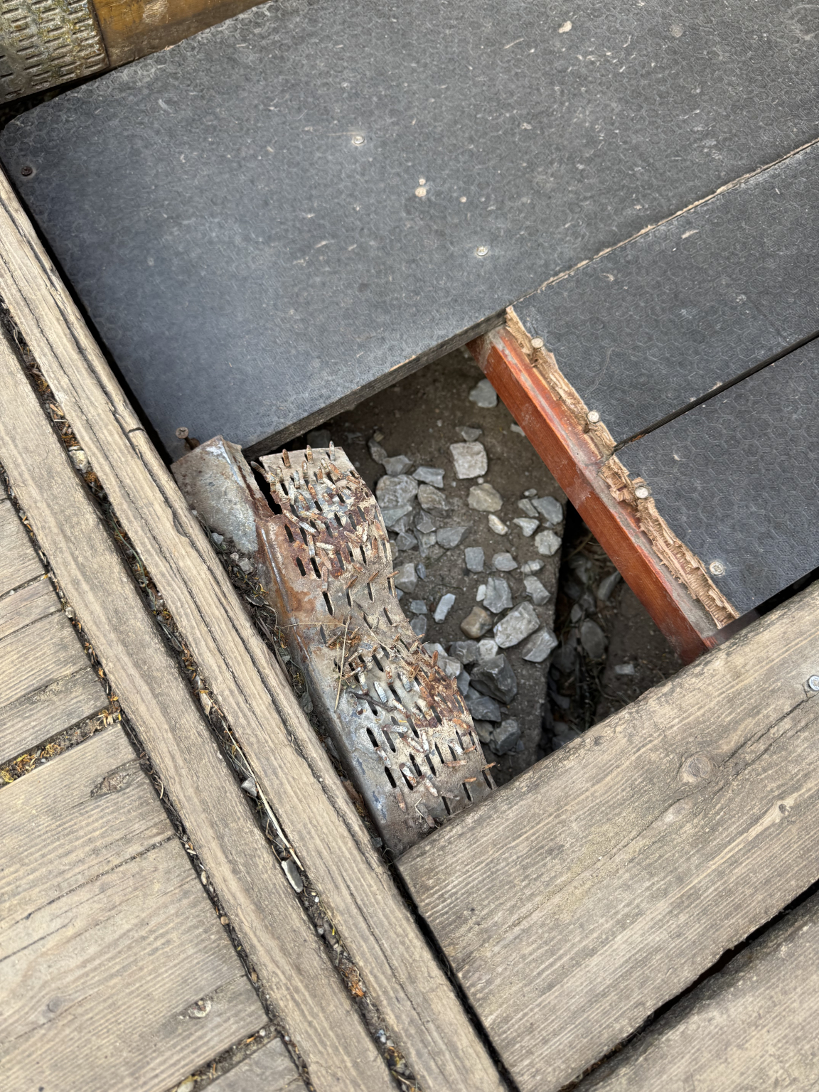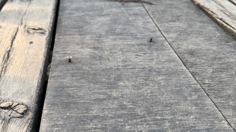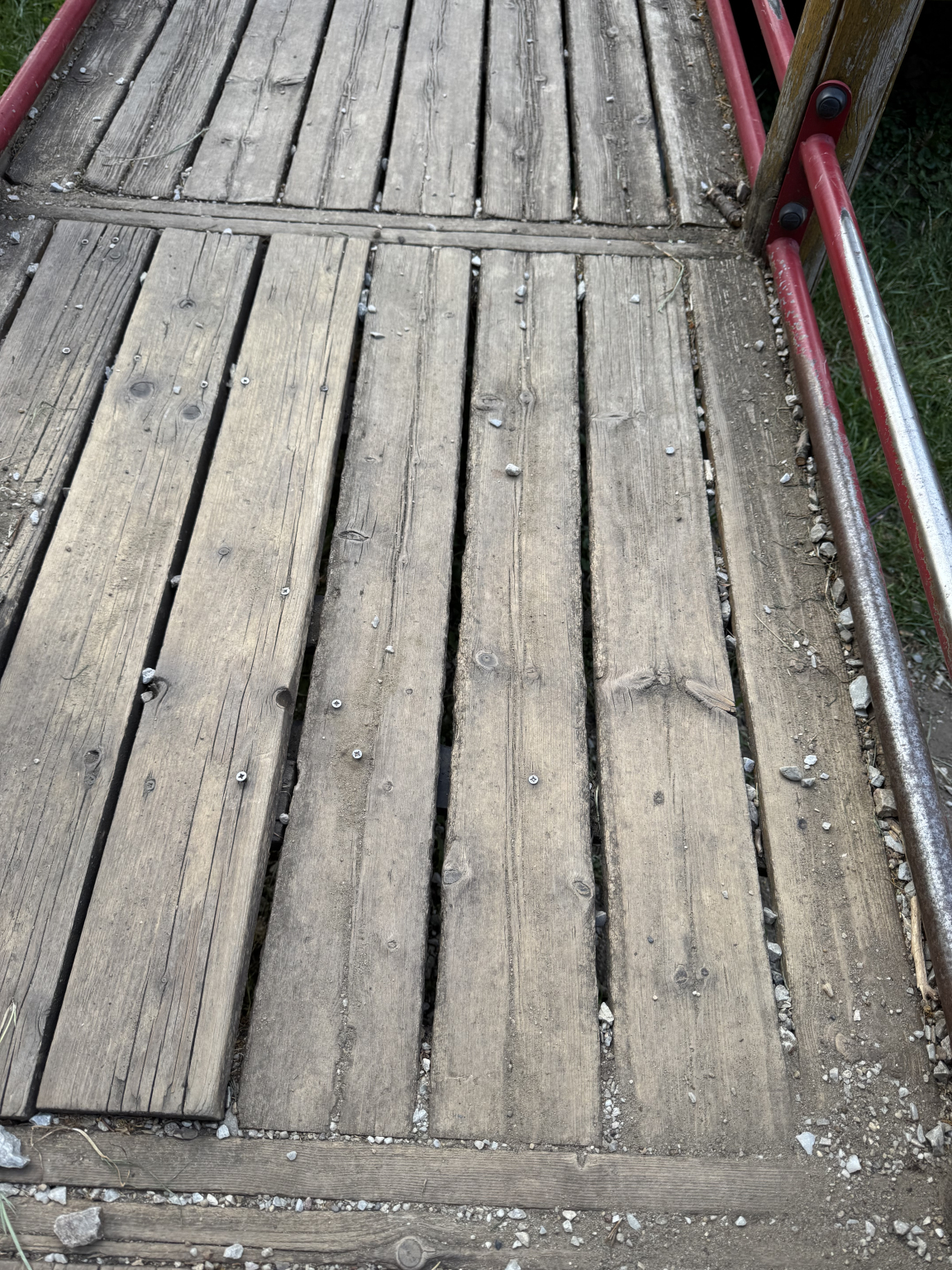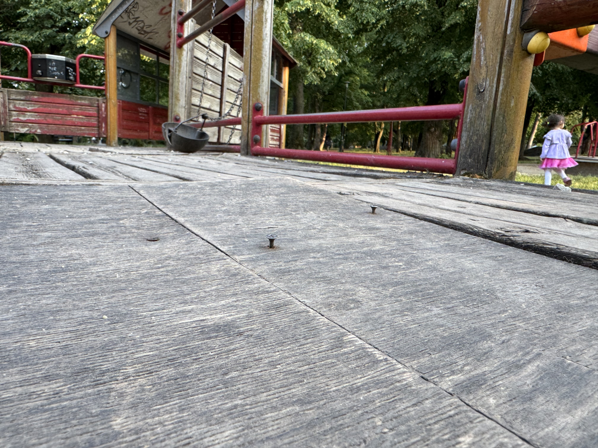 A játszótéri játék deszka része balesetveszélyes. Vagy le van szakadva, vagy kilógnak belőle a csavarok.