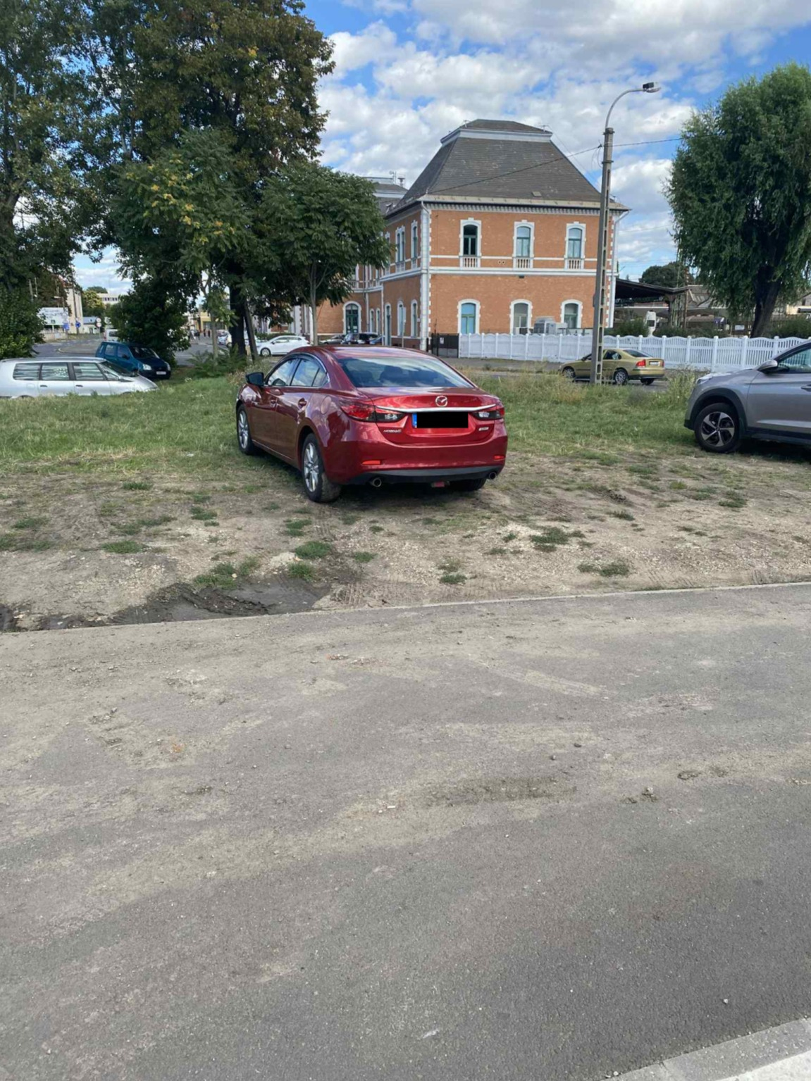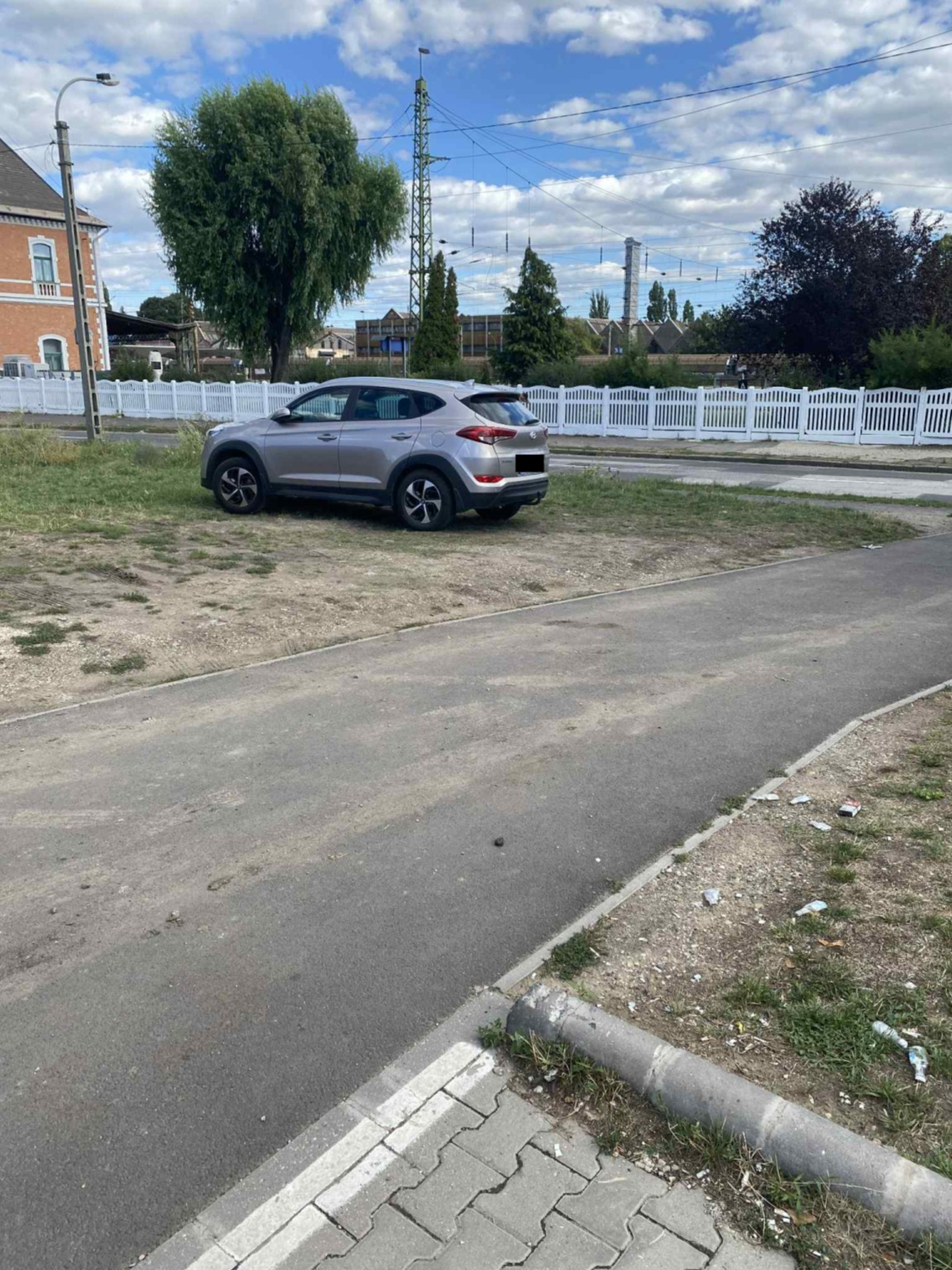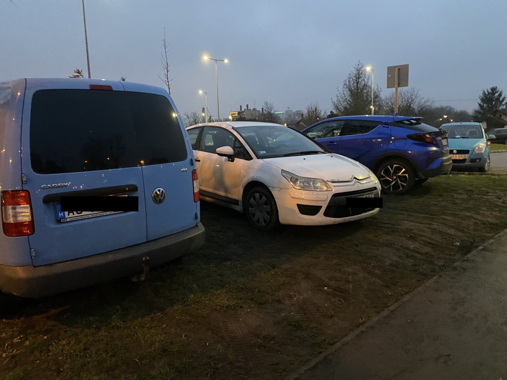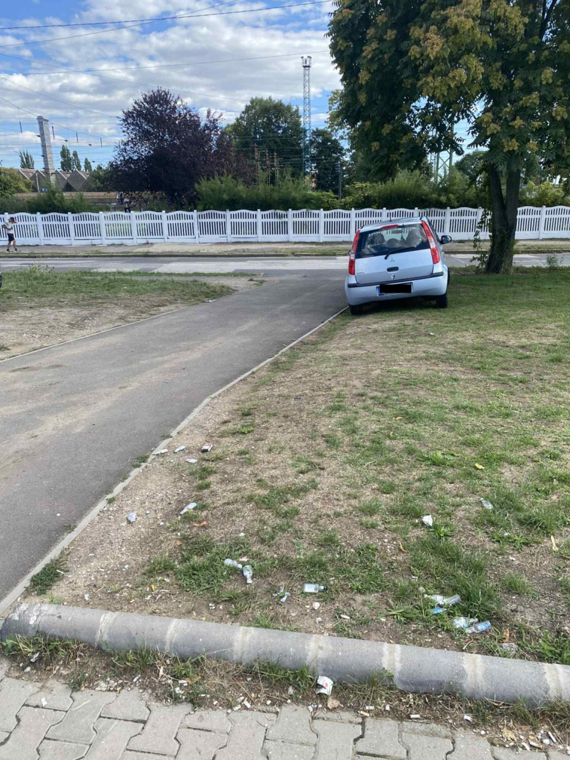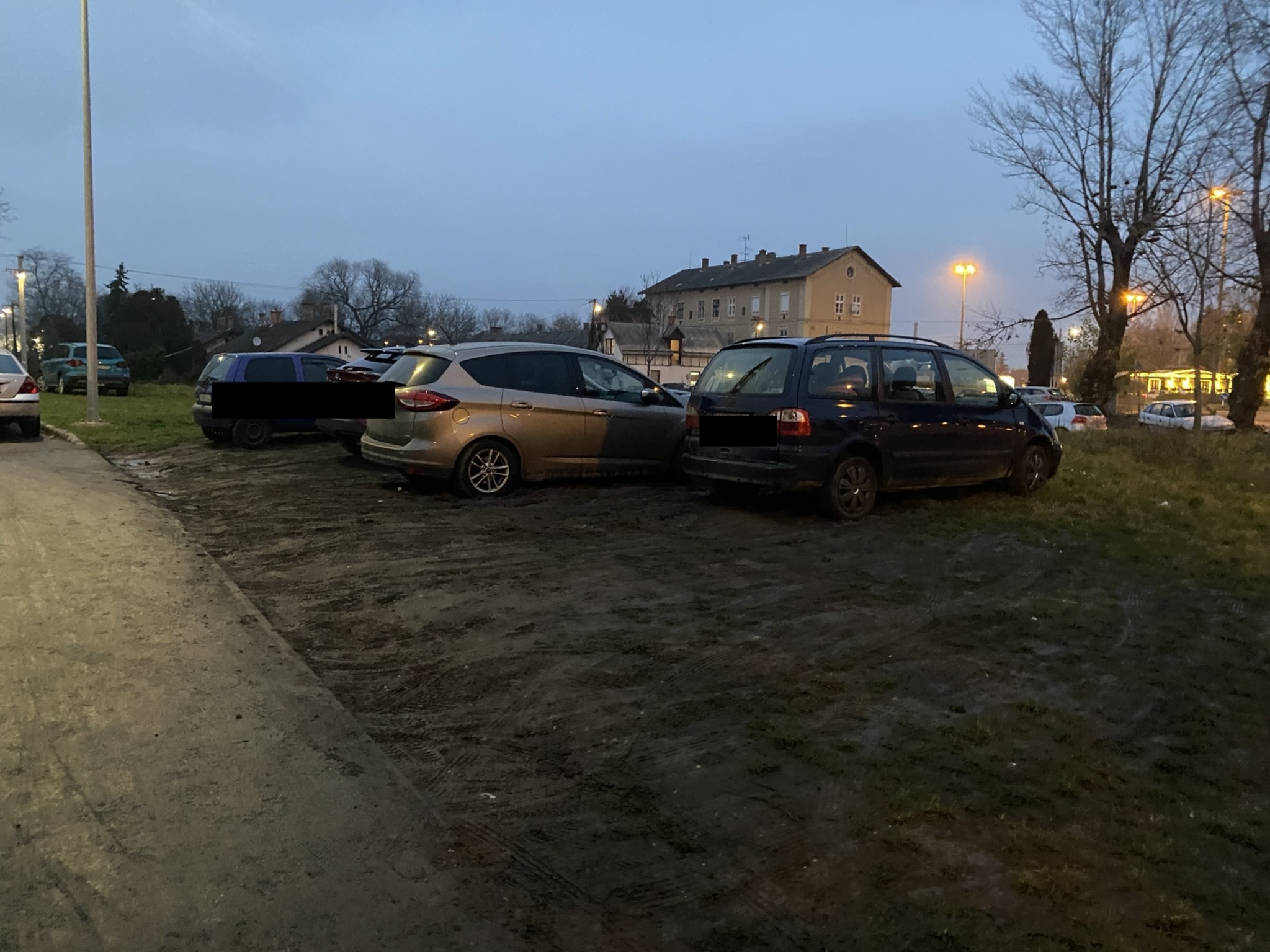 A Tiszai pályaudvar melletti parkolóban rendszeres a zöldterületen való parkolás és a parkolóba való behajtás a járdán.