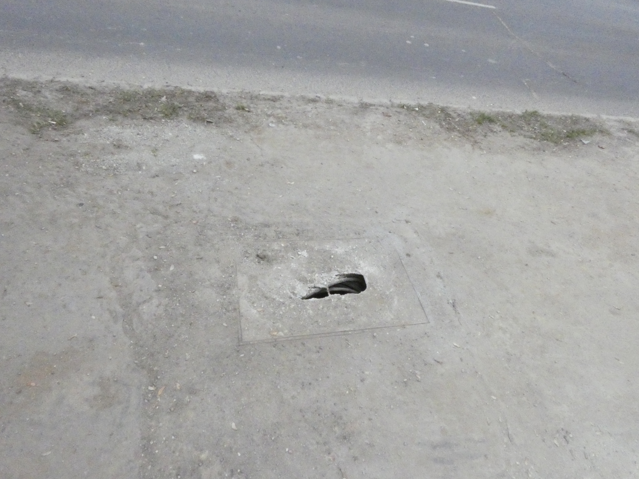 Távközlési aknafedlap beszakadása járda közepén