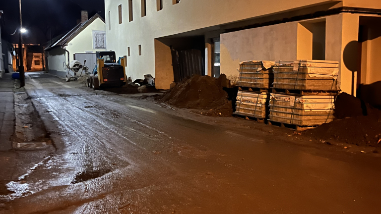 Hetek óta vastagon föld borítja mindkét utca burkolatàt amiből most az eső miatt csúszós sártenger lett.
