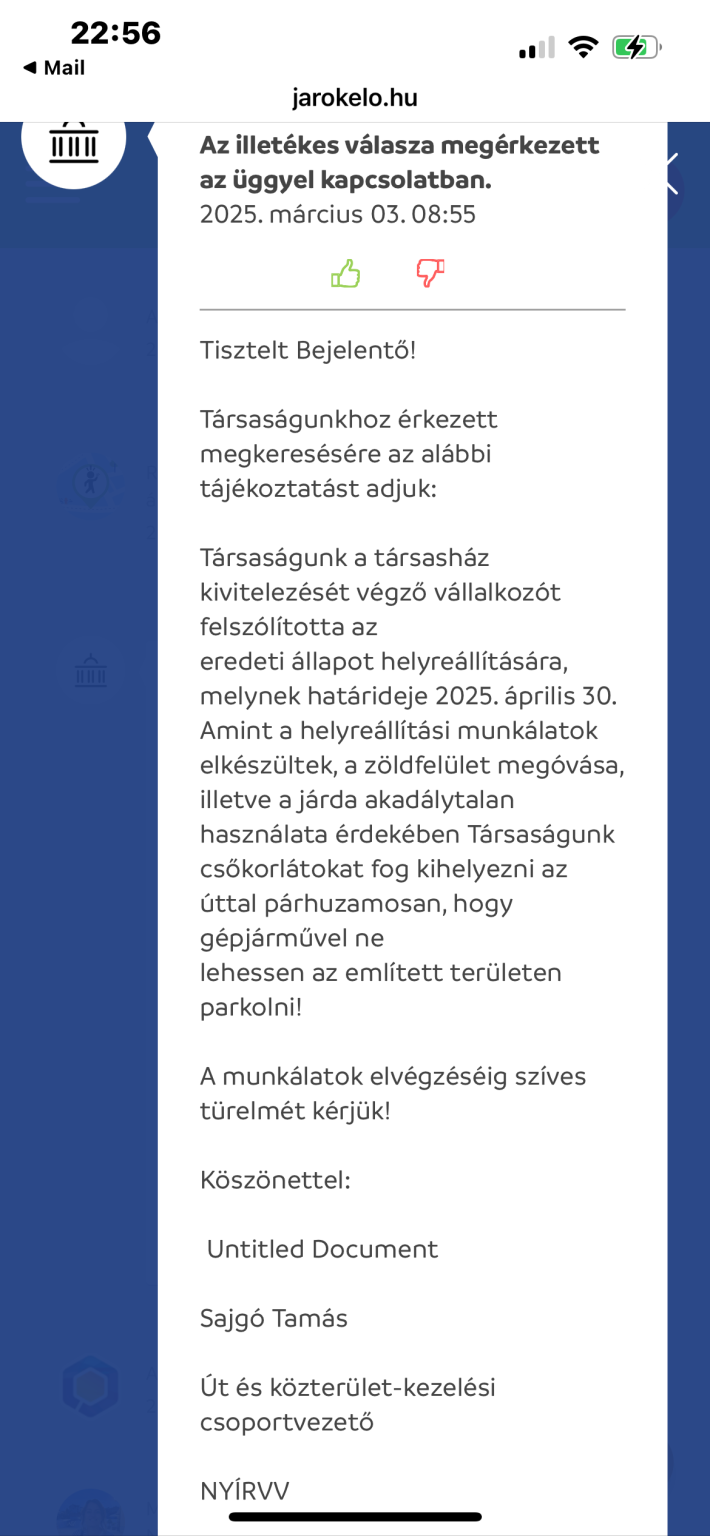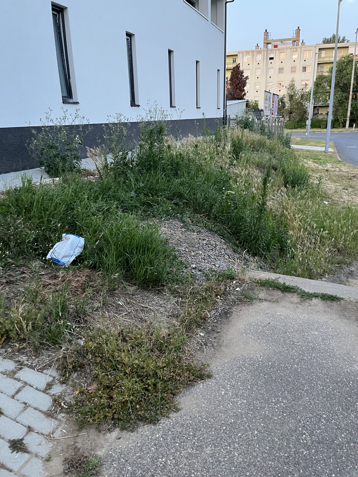 „A bejelentés óta nem történt meg a helyreállítás,,gazos,parlagfüves a terület,továbbra is autók parkolnak ott,a járda sincs kijavítva.”