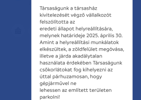„A zöldfelület visszaállítása nem történt meg, tovább kopott a fű, a járda járhatatlan és már a szőnyegszalon előtti ápolt füves területre is parkolnak.”