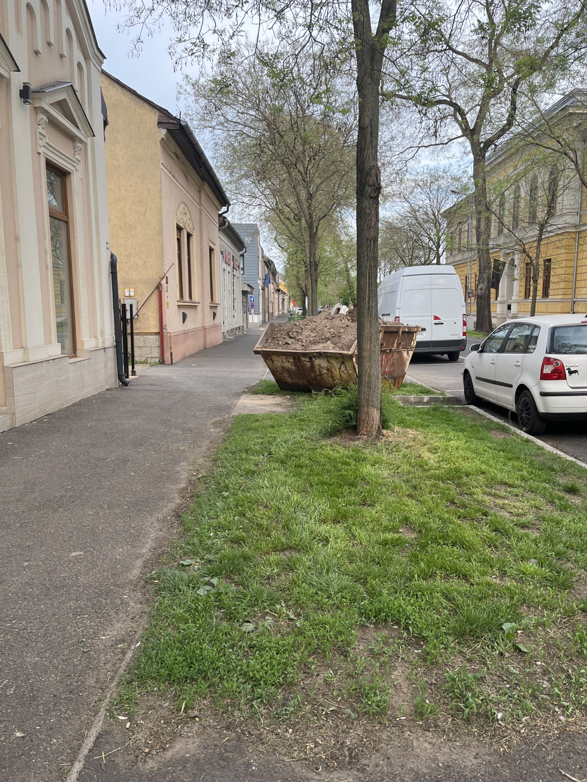A Szent István utcai fasorban konténer,kéreghiányos fa,évekkel ezelőtt letört ágú fa,lejárt zöldfelület a körforgalomnál.