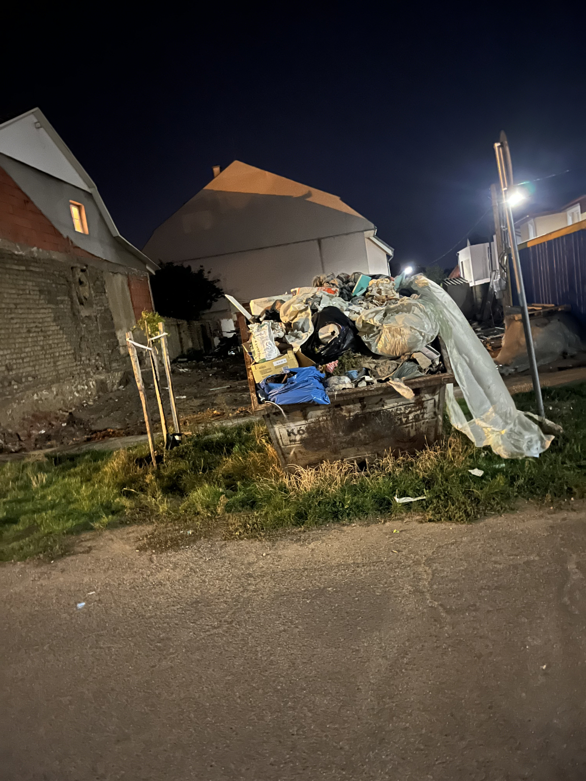 A Rózsa utcán az építkezés nincs elkerítve.a konténer fedetlen,a környék szemetes,mert a szél hordja minden irányba a szemetet