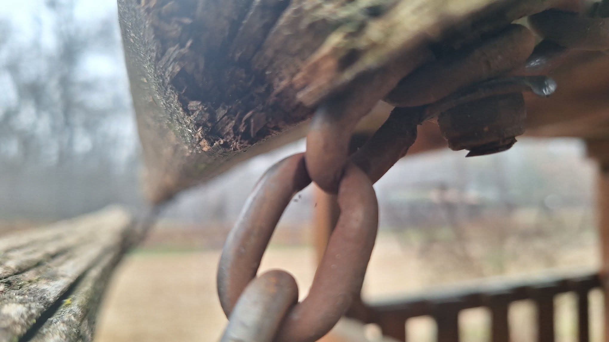 Az erdei tornapályán a gyerek játszótéren, a mászókán, papír vékonyra van kopva a lánc.