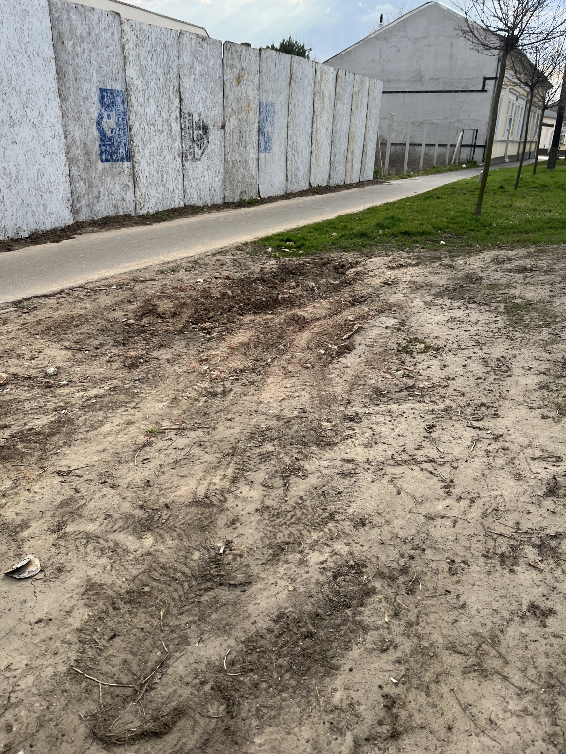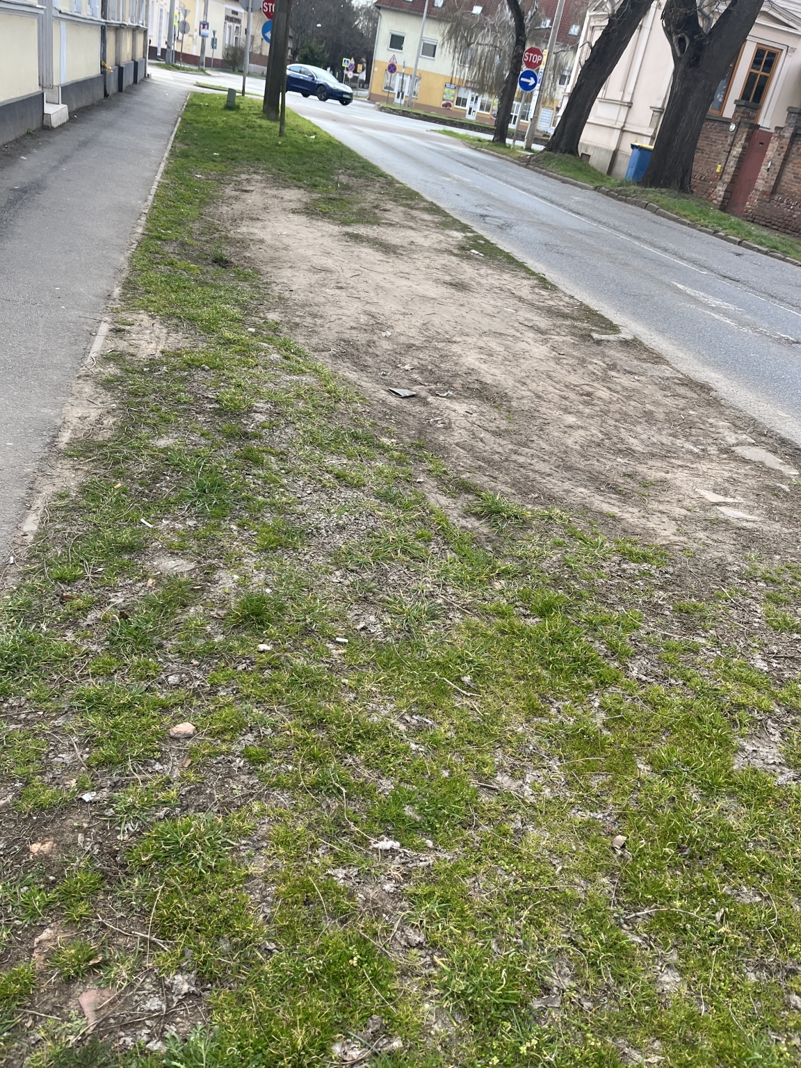 Az Eötvös utcán a járda és az úttest közötti zöldsáv kikopott a parkoló autók tönkretették, a kiszáradt fák nincsenek pótolva.