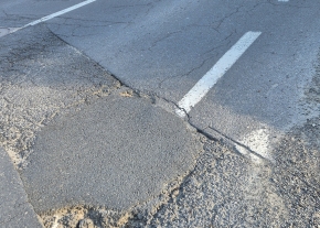 Pont a kanyarban, ahol még kétirányú a forgalom, ezért ha szembe jön autó, szinte lehetetlen kikerülni. Körülötte is van még néhány kisebb kátyú.