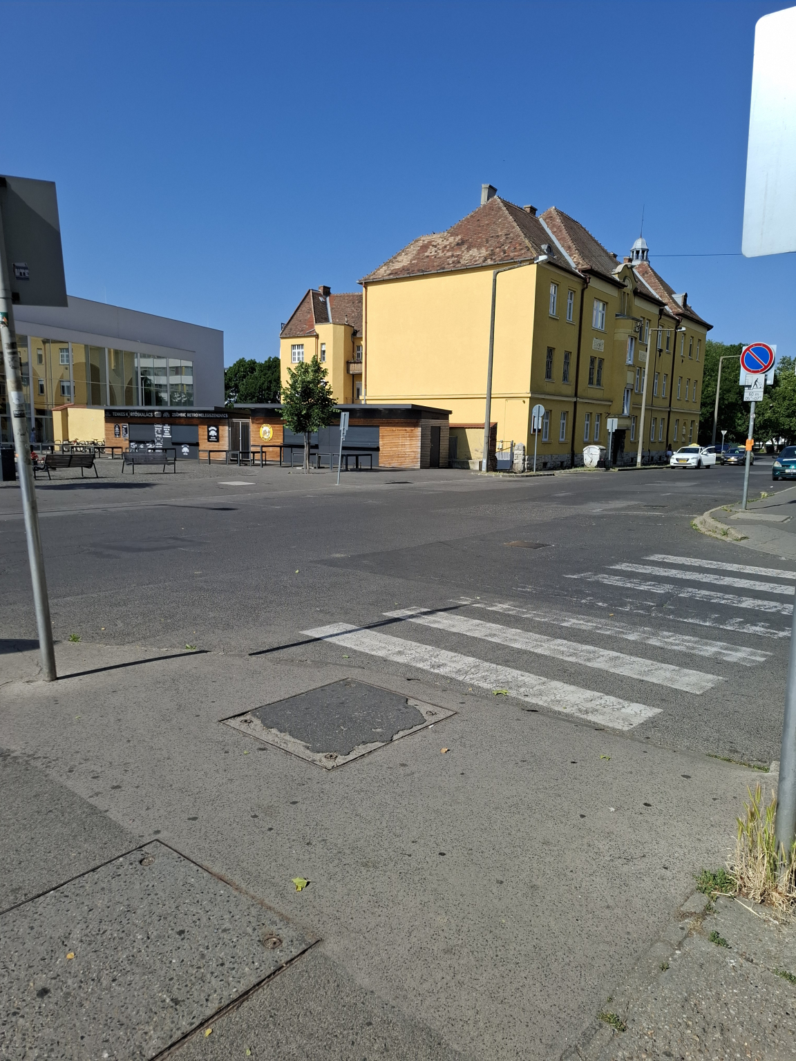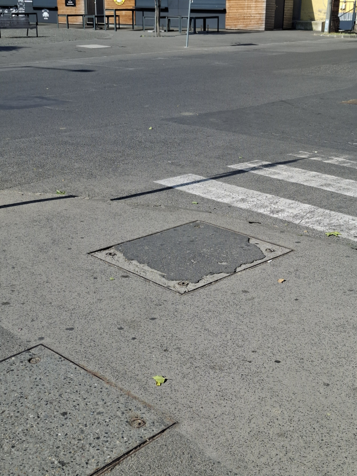 Az autóbusz megálló és a Dohánybolt előtti gyalogátkelőhelynél az aknafedél botlásveszèlyes.