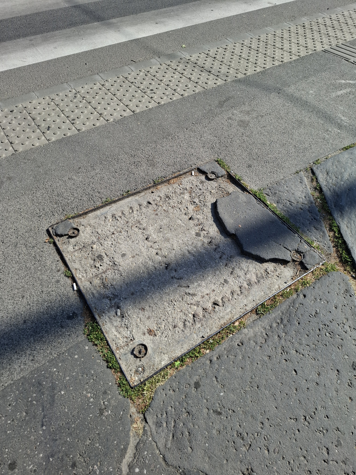 A gyalogátkelőnél rendkívül botlásveszèlyes az aknafedél. Kérem mielőbb javítsák!