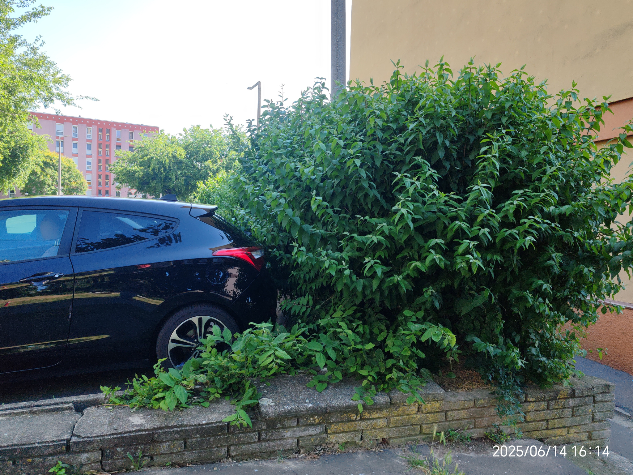 Nagy Imre út 61. melletti parkolóba nagyon belóg a bokor.