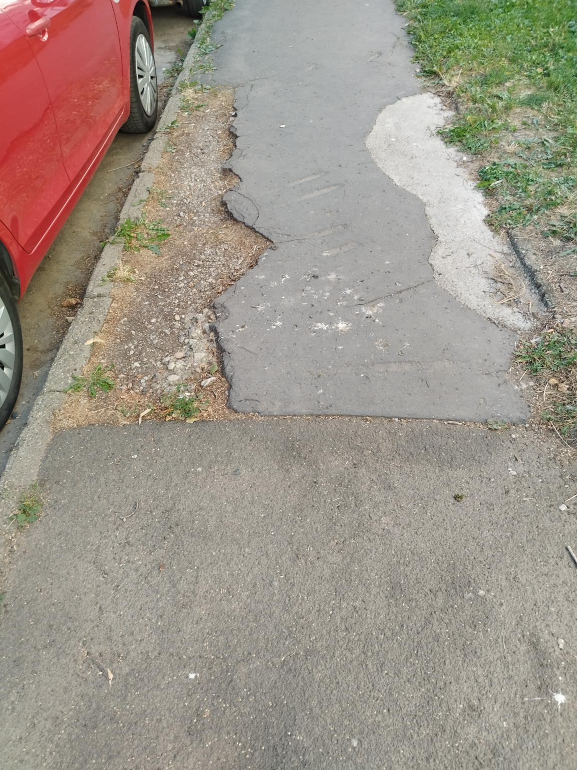 Feltöredezett a járda, aminek évek múltán láthatóan valaki önszántából nekiállt! De csak a felét töltötte fel. Azt is úgy ahogy.
