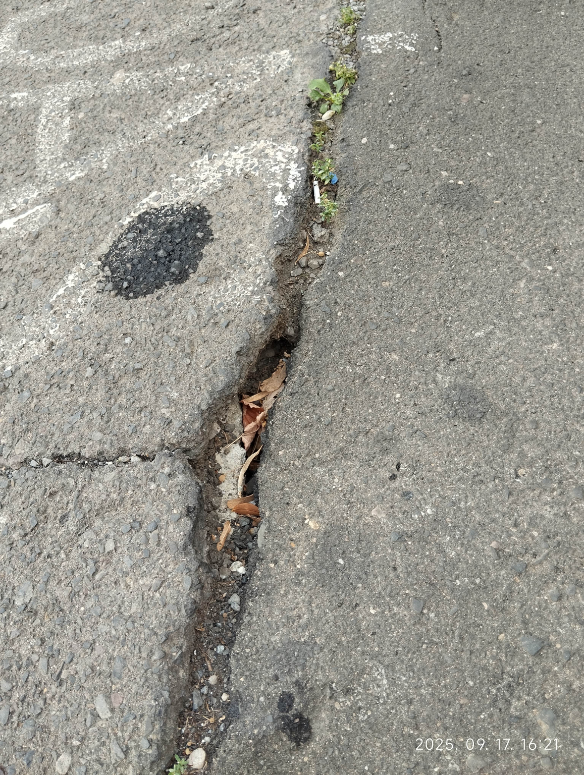 7632 Pécs, Kodolányi János utca 23. előtt az úttest megrepedt, több ujjnyi vastagságban teljesen szétvált, a a befolyó esővíz a földet kimosta, és mellette lévő járda megsüllyedt. A repedésen keresztül az esővíz folyamatosan alámossa az úttestet amin autók parkolnak, előbb utóbb beszakad.
