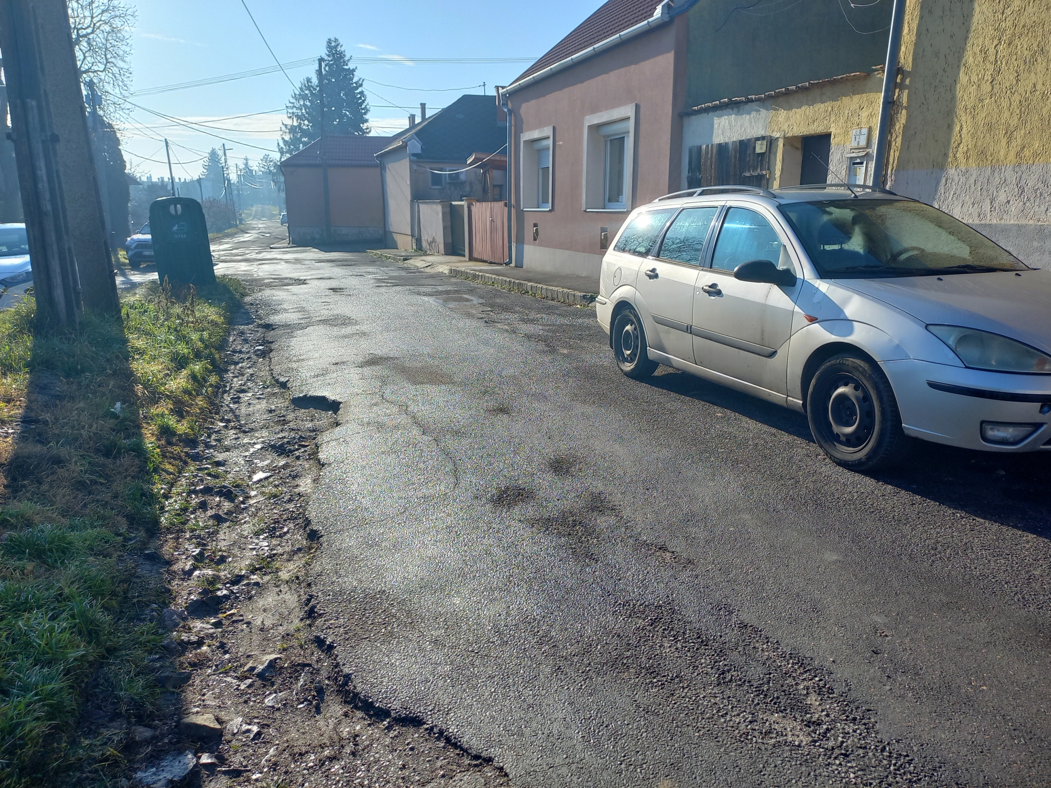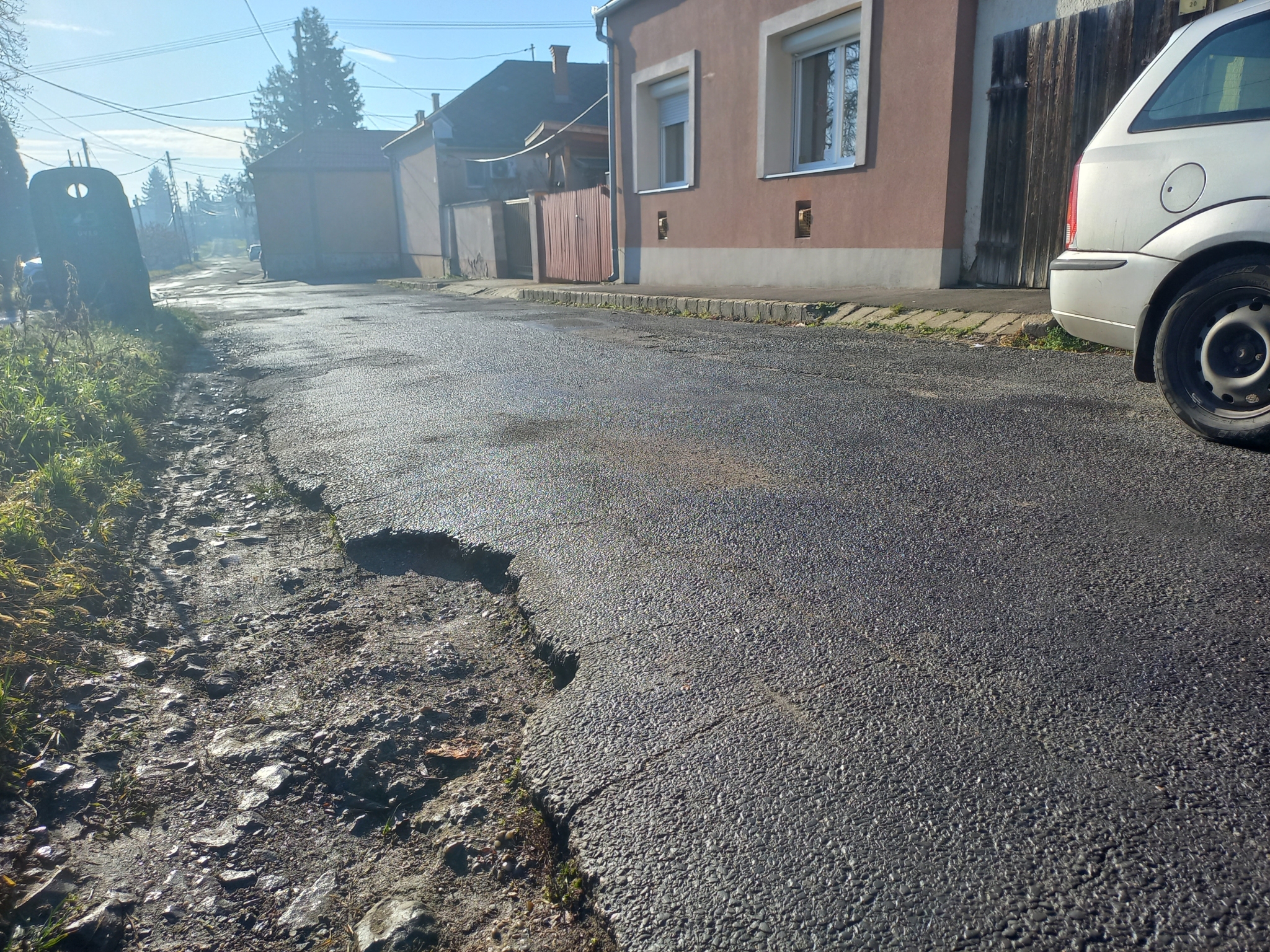 Pécs Hajnal utca 20 Sarló utca felől mély kátyú