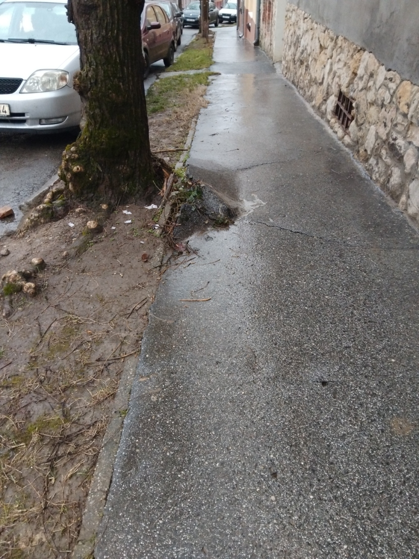 A járdát megemelte egy fa gyökere, sötétben balesetveszélyes.