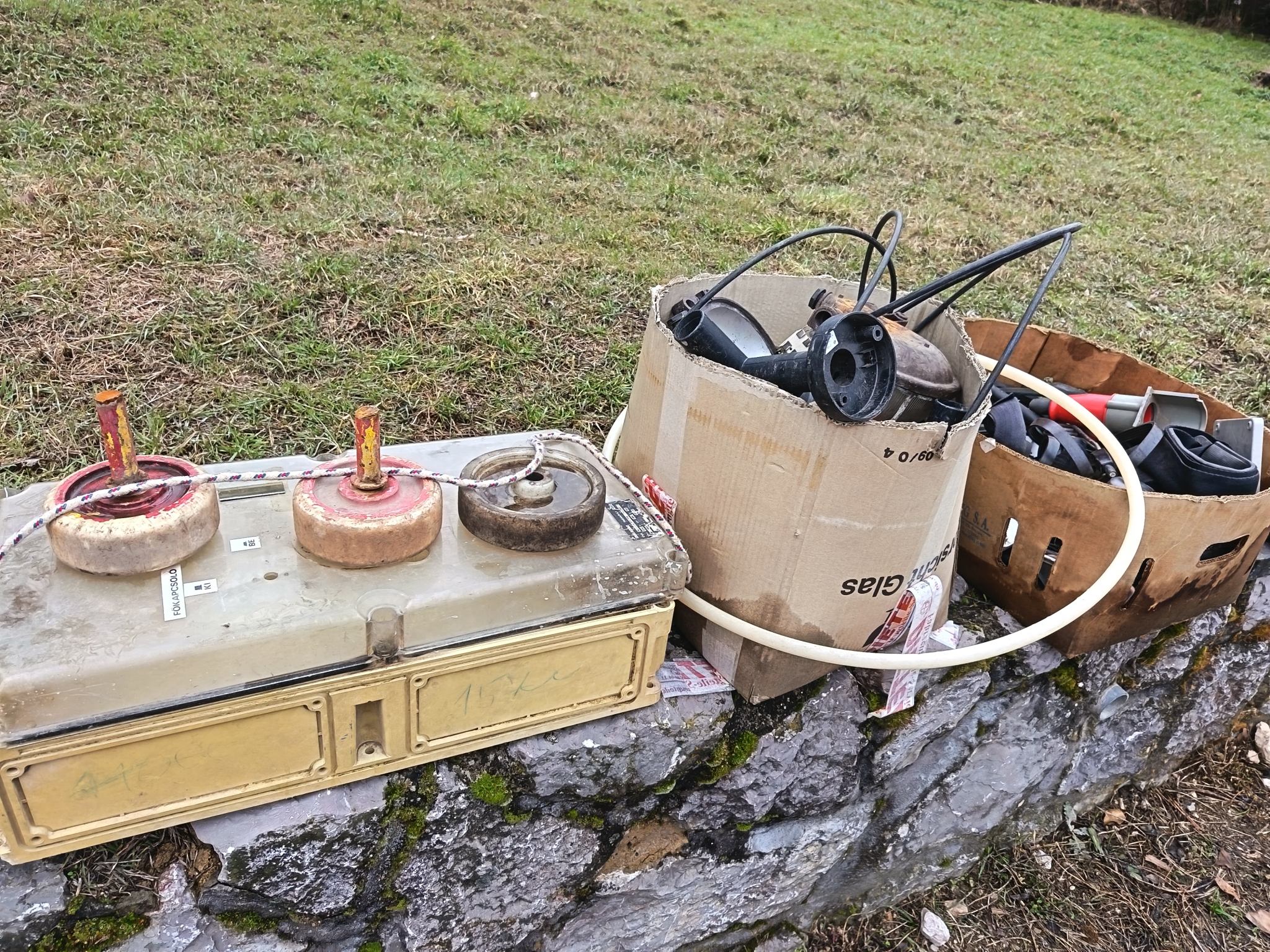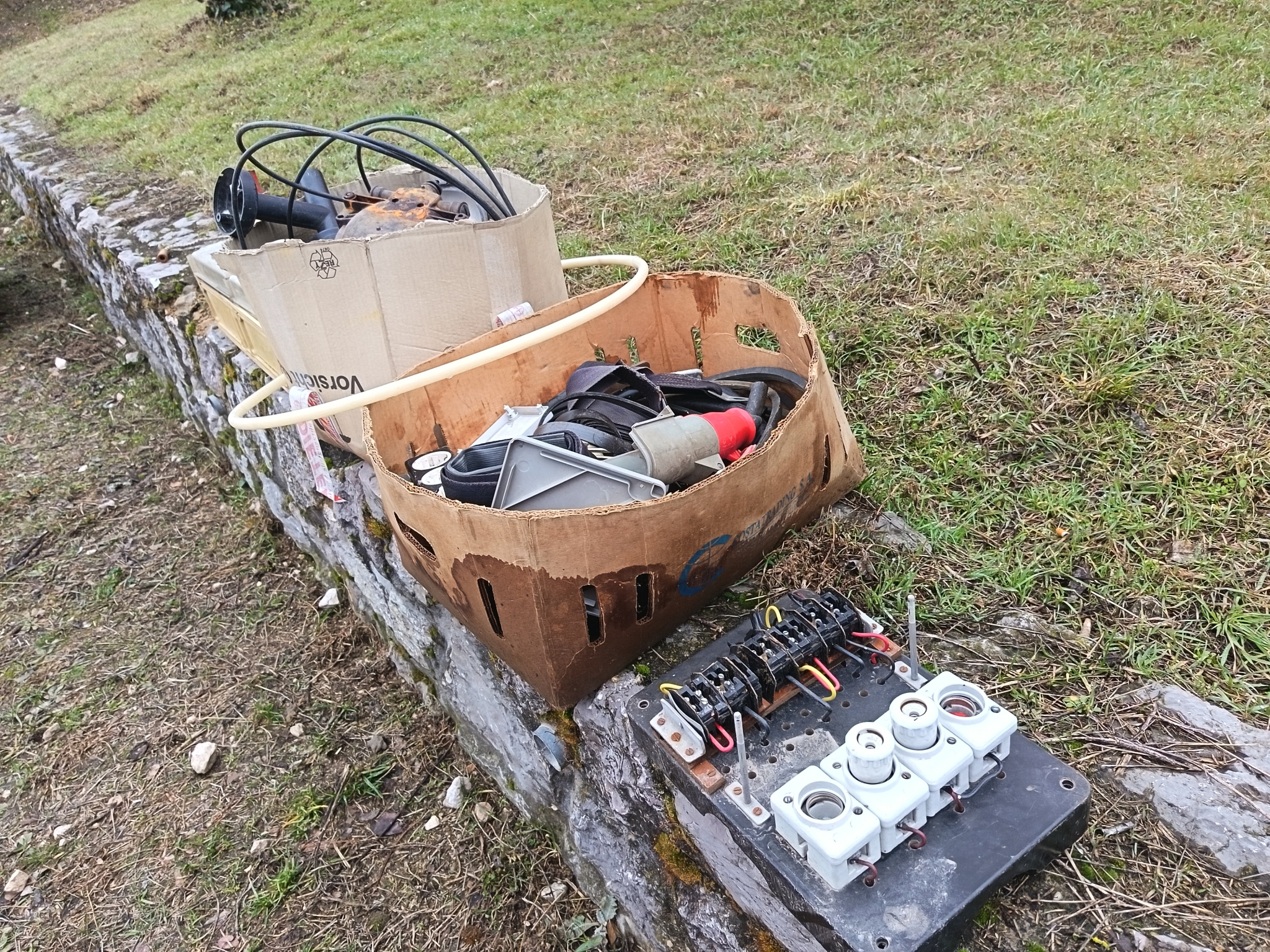 Havihegyi templom parkoló támfalára kitett villamossági alkatrészek.
