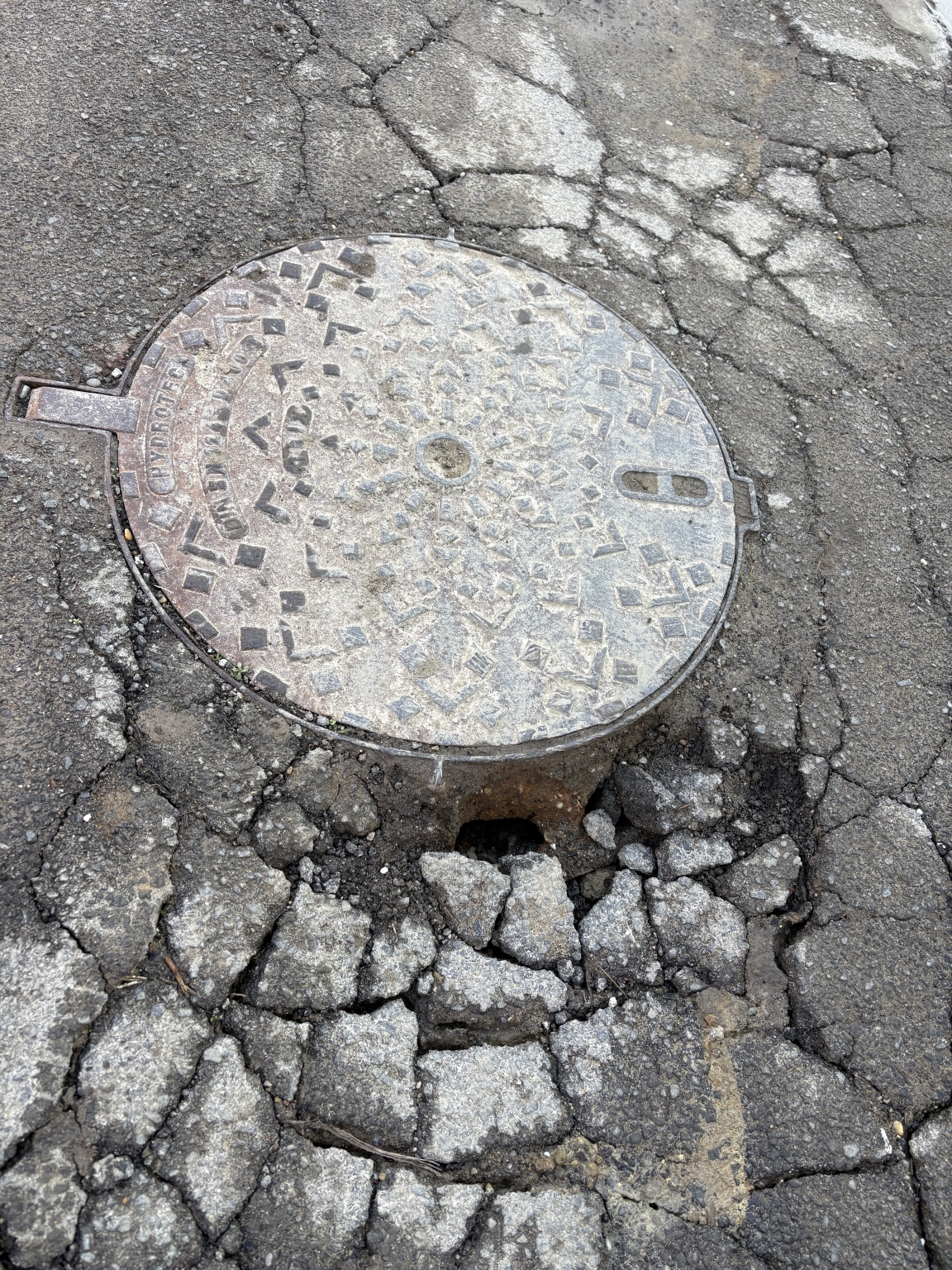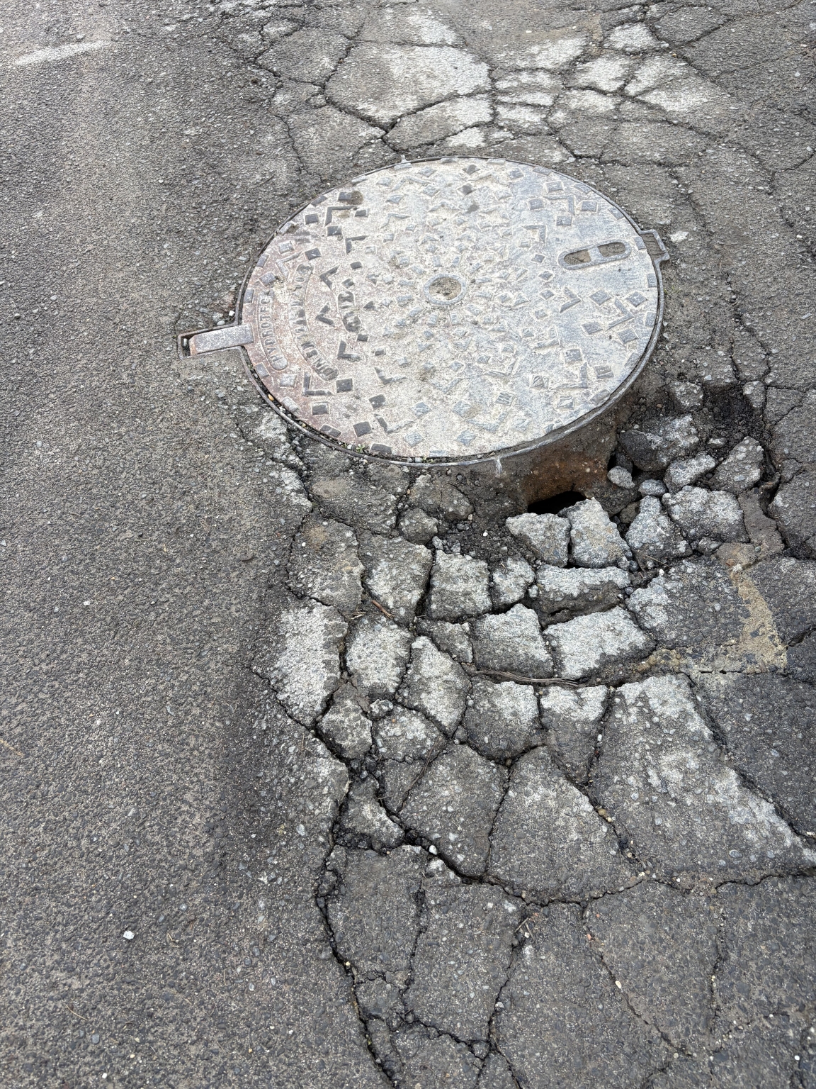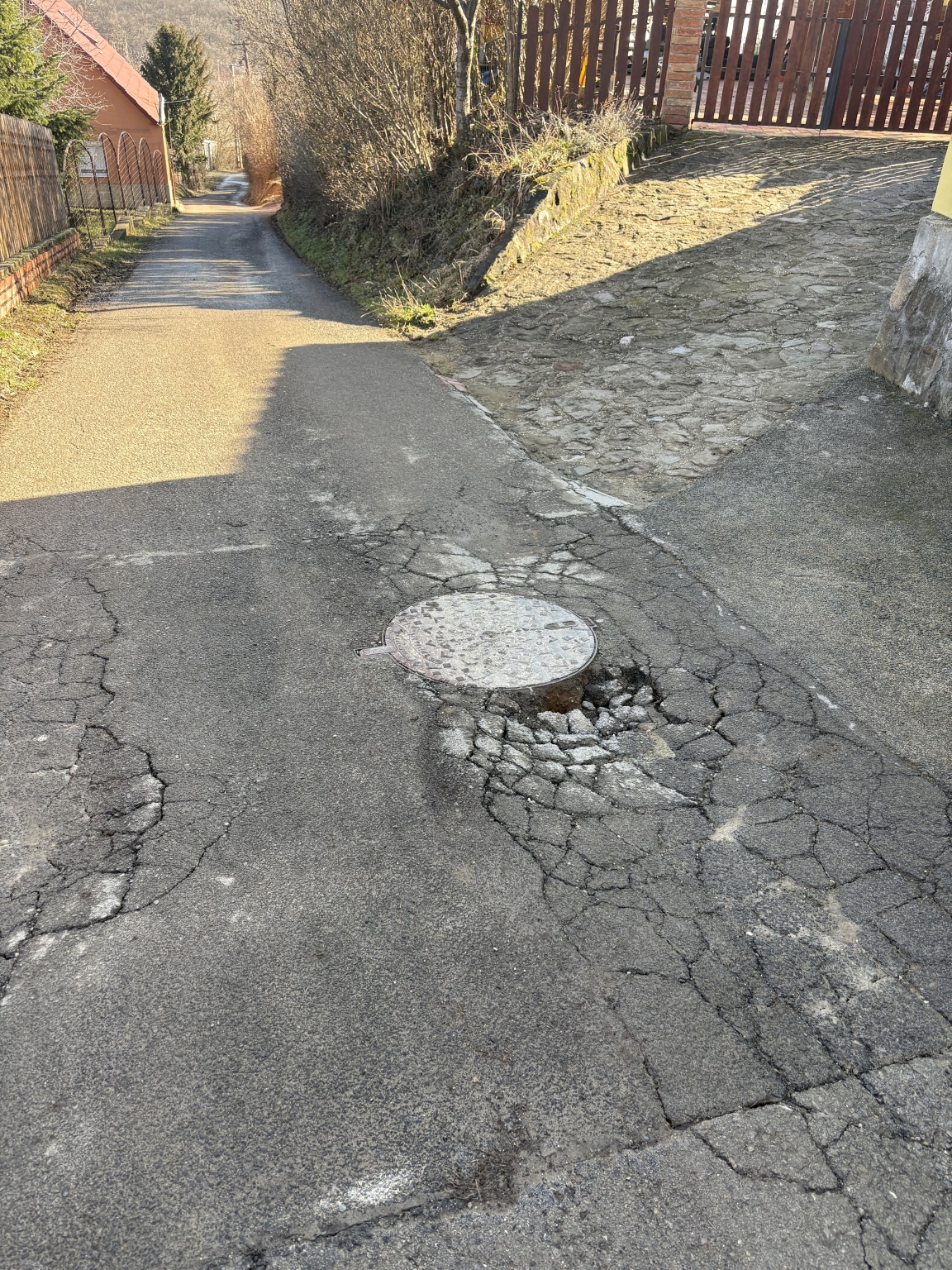 Csatornafedél mellett veszélyes kátyú. Már van egy lyuk rajta, be lehet látni a föld alá.
