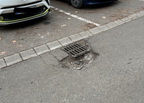 A pécsi Ady Endre utca és Márton utca kereszteződésében van egy csapadékvíz-elvezető rács, amely mellett a betonozás széttöredezett. A kátyú és a vasrács szabaddá vált peremei már veszélyesek az itt áthaladó forgalomra.