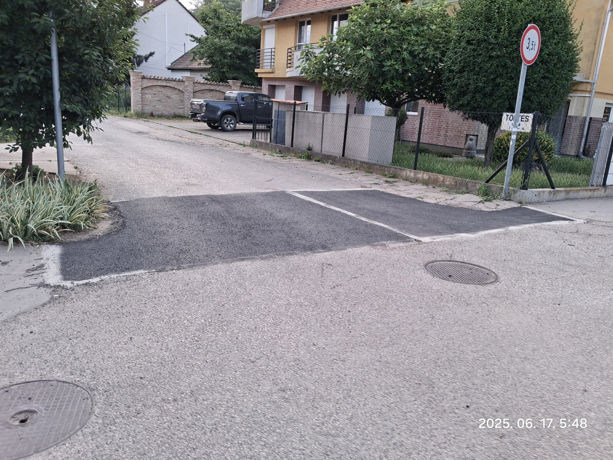 Kátyús út Újszegeden a Töltés utca és Bal fasor sarkán