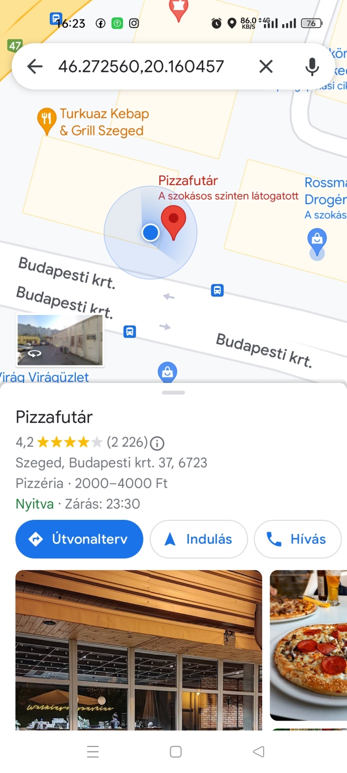 Tisztelt Ügyfélszolgálat! Szegeden a Budapesti krt-on a Rossmann és a pizzázó előtt egy nagyon balesetveszélyes kis gödör van a kerékpárút kellős közepén. Kérem, javítsák. Köszönöm! Tisztelettel és üdvözlettel: Farkasné Antal Anikó